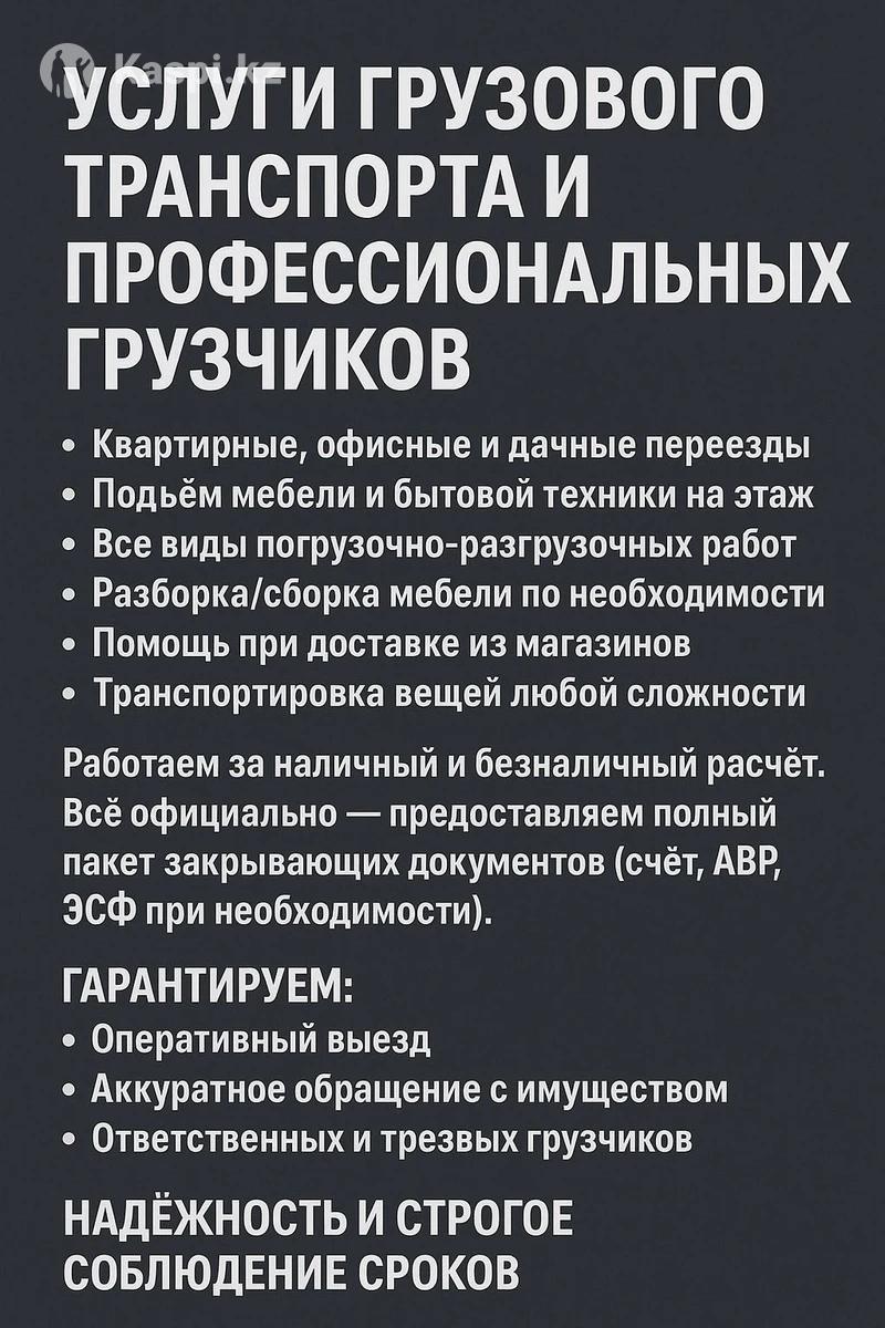 Предлагаем полный комплекс услуги по переездам и погрузочно-разгрузочным работам: • Квартирные, офисные и дачные переезды • Подъем мебели и бытовой техники на этаж • Все виды погрузочно-разгрузочных работ • Разборка/сборка мебели по необходимости • Помощь при доставке из магазинов • Транспортировка вещей любой сложности Работаем за наличный и безналичный расчет. Все официально — предоставляем полный пакет закрывающих документов (счет, АВР, ЭСФ при необходимости). Гарантируем: • Оперативный выезд • Аккуратное обращение с имуществом • Ответственных и трезвых грузчиков • Надежность и строгое соблюдение сроков • Индивидуальный подход к каждому клиенту + Звоните в любое время.