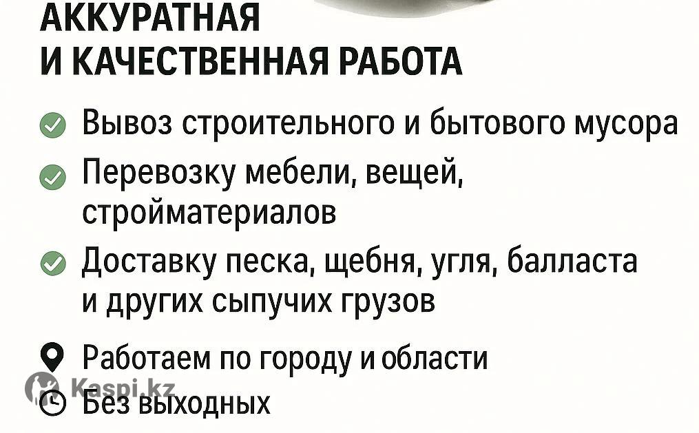 Услуги Газели 3 тонны — Самосвал | Караганда и область ✅ Газель самосвал открытого типа ✅ Грузоподъемность до 3 тонн ✅ Имеется тент ✅ Аккуратная и качественная работа Выполняем: • Вывоз строительного и бытового мусора • Перевозку мебели, вещей, стройматериалов • Доставку песка, щебня, угля, балласта и других сыпучих грузов 📍 Работаем по городу и области 🕐 Без выходных 📱 Звоните / пишите в