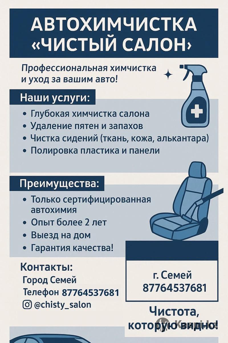 Предлагаемые услуги: •Полная химчистка салона автомобиля •Удаление средних и глубоких загрязнений •Чистка сидений, пола, потолка и обшивки дверей •Уход за кожаными сиденьями •Удаление неприятных запахов Наши преимущества: •Опытные специалисты •Качественная и безопасная химия •Быстрая и аккуратная работа •Доступные цены •Выезд к клиенту (мобильная химчистка) Время работы: Ежедневно, с 09:00 до 22:00