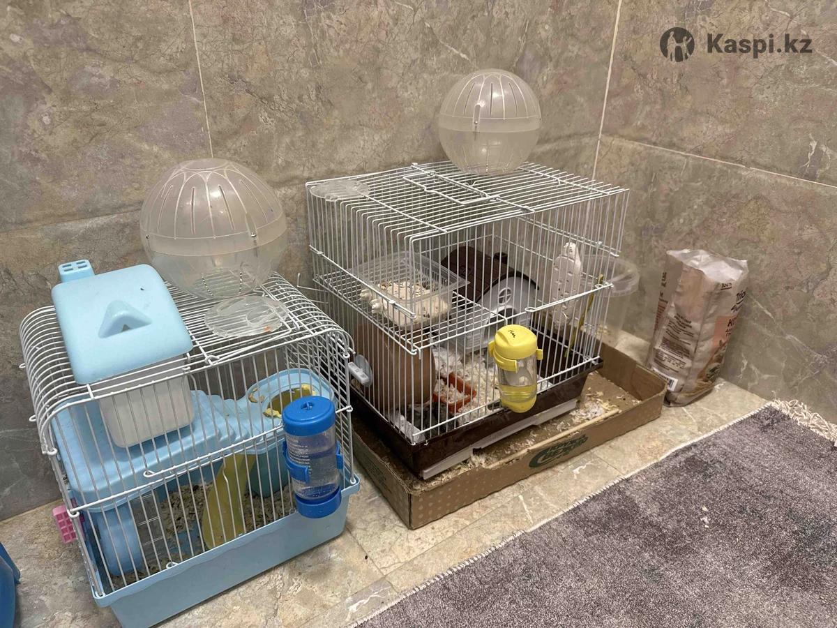 Продаем 2 клетки и 5 хомяков! 2 прогулочных шара и есть песок для купания хомячков. Находимся в Жас канате