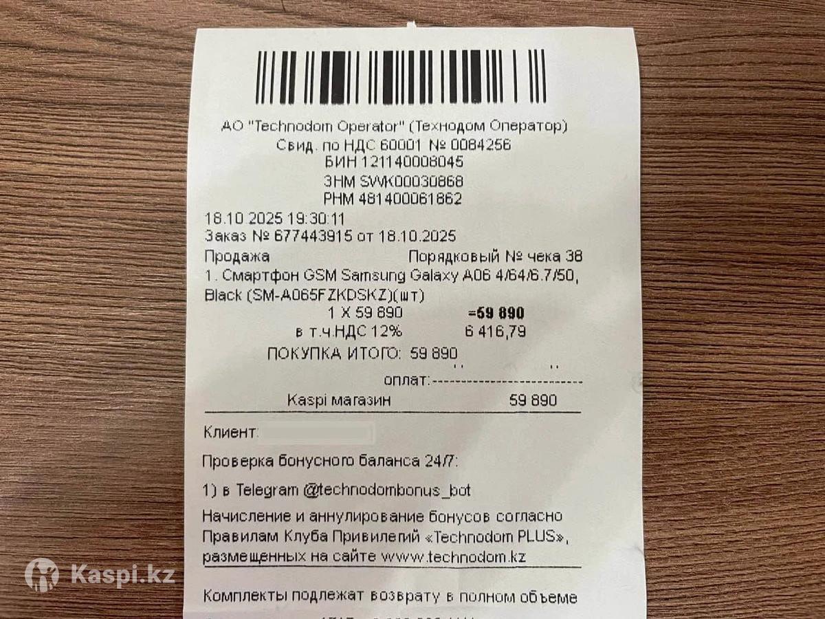 Продам смартфон Samsung A06 64/4 Black. Телефон новый, не распечатанный. Куплен в магазине "Технодом" 18 октября 2025г. Без торга и обмена.