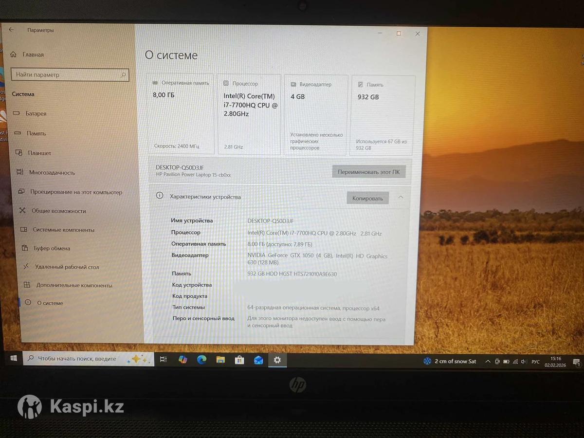 Продам отличный ноутбук HP Pavilion Power 15 в стильном черном корпусе. Ноутбук универсален: тянет игры, сложные программы для дизайна (Adobe Photoshop, AutoCAD) и идеально подходит для учебы или работы. 🇰🇿 Характеристики: Процессор: Intel Core i7-7700HQ (8 потоков, высокая производительность). Видеокарта: NVIDIA GeForce GTX 1050 (4 GB). Оперативная память: 8 GB DDR4. Память: HDD 1000 GB (1 ТБ) — места хватит для всего. Экран: 15.6" Full HD (1920x1080) матовый, антибликовый. Клавиатура: С подсветкой (удобно работать ночью). 💎 Состояние и комплектация: Ноутбук прошел полную проверку, работает стабильно. В комплекте: оригинальное зарядное устройство. Корпус в хорошем состоянии.
