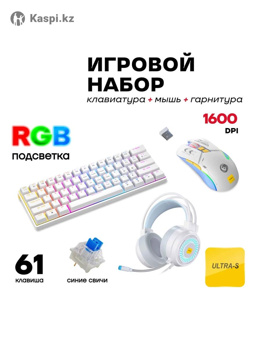 Игровой набор: клавиатура + мышь + гарнитура Қазақша: 🔹 RGB жарықтандыру – ойын кезінде әдемі эффект 🔹 Клавиатура: •61 перне, ықшам дизайн •Мембраналық пернелер (тыныш, жұмсақ басылады) 🔹 Тінтуір (мышь): •1600 DPI •Эргономикалық пішін •RGB жарық 🔹 Гарнитура (наушник + микрофон): •Таза дыбыс •Жұмсақ құлаққаптар •Микрофонмен 🔹 Қосылуы: USB 🔹 Жағдайы: Жаңа 🔹 Компьютер мен ноутбукке сай ⸻ Русский: 🔹 RGB-подсветка – стильный игровой эффект 🔹 Клавиатура: •61 клавиша, компактный дизайн •Мембранные клавиши (тихое и мягкое нажатие) 🔹 Мышь: •1600 DPI •Эргономичный дизайн •RGB-подсветка 🔹 Гарнитура (наушники с микрофоном): •Чистый звук •Мягкие амбушюры •Встроенный микрофон 🔹 Подключение: USB 🔹 Состояние: новое 🔹 Подходит для ПК и ноутбука