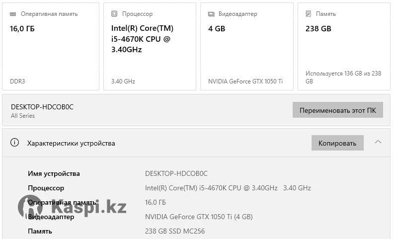 Продам игровой компьютер. Характеристики: 16 GB ОЗУ Intel i5-4670K CPU 3.4GHz Geforce GTX 1050 Ti 4GB SSD 256 GB