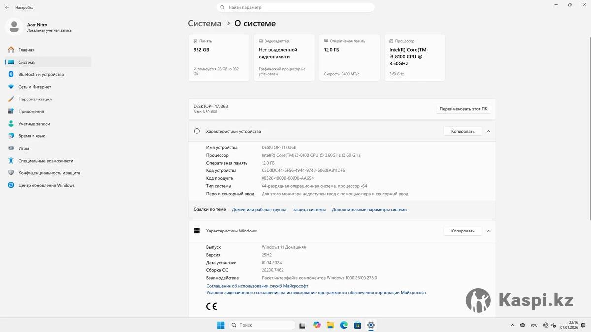 Использовался около 2 лет, после чего 2 года стоял без дела, так как купил ноутбук. Состояние хорошее. Компьютер регулярно чистился от пыли, ничего не перегревалось, все работает стабильно. Установлена Windows 11 (активирована), система сброшена до заводских настроек -полностью готов к использованию. Оперативная память - 12 ГБ DDR4 (8 ГБ докупал отдельно). Для игр, работы, программирования и многозадачности хватает без проблем. По производительности: ПК среднего игрового уровня. Подходит для CS2, CS:GO, Fortnite и других популярных игр - комфортный FPS в Full HD при адекватных настройках. Синглплеер-игры вроде The Witcher 3, GTA V идут нормально на средних/высоких настройках (в зависимости от конфигурации). Если нужен компьютер, чтобы иногда поиграть и без проблем работать/учиться - отличный вариант. Причина продажи - больше не нужен. Все дополнительные характеристики и варианты конфигураций можно посмотреть в интернете по названию модели: Acer Nitro N50-600. Готов показать в работе при встрече, осталась коробка если нужна. Торг возможен.