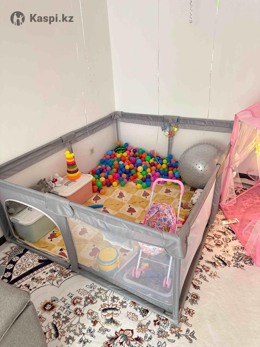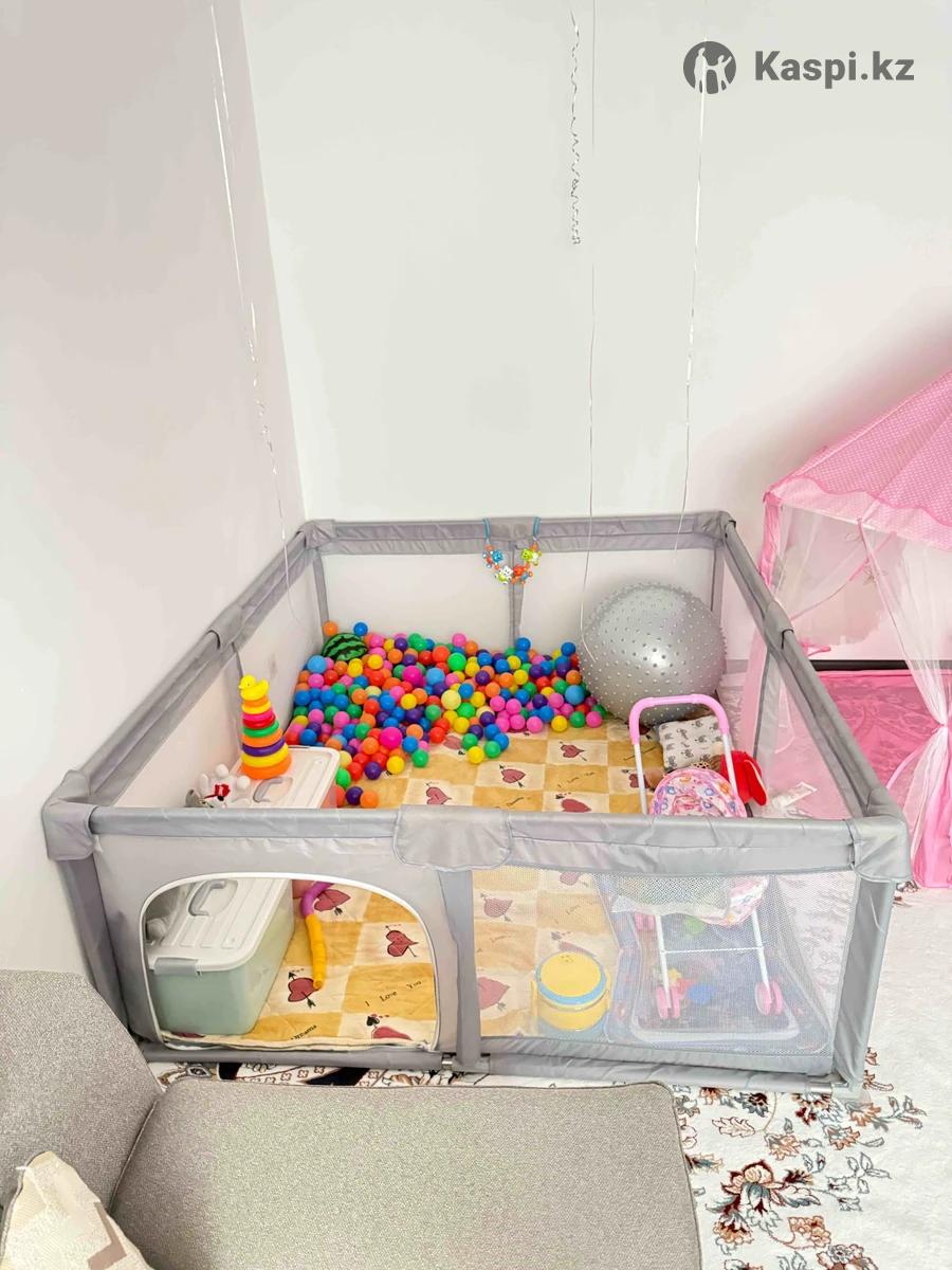 В отличном состоянии. Манеж с высотой бортов 65 сантиметров, шириной 50, длиной 180 сантиметров. Ребра жесткости из металла никелированные. Уголки пластик добротный. Очень практичная ткань тент и сетка. Рабочий замочек двери. Есть сумка для переноса. Продается без игрушек. Цена указана только на сам манеж. Функционально полезная вещь для малыша: научится ходить 100% держась за стенки и поможет маме сберечь нервы в части безопасности и чистоты дома. Если шарики нужны, то продам отдельно за 10 000 тенге (там 400 штук по 5 сантиметров и 50 штук по 7 сантиметров. Рекомендации Монтессори - разные размеры, разные цвета.