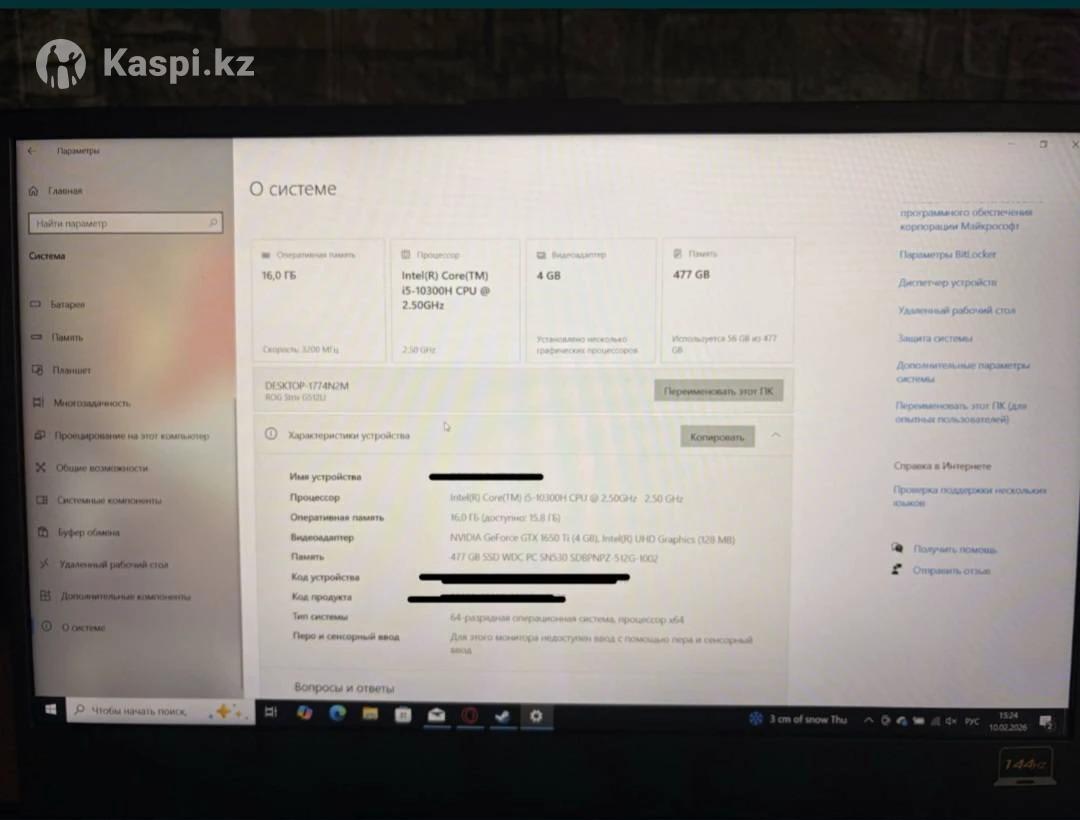 Видео карта nvicla 1650ti Процессор IntellR) Core(TM) 15-10300H CPU 2.50GH72.50 GHZe Оперативная память 160гБ озу Видеоадаптер Intelr UHD Graphics (28 MB Память IntelRJ UHID Graphics (128 MB) 477 GB SSD WDC PC SN5SO SDBPNPZ-S126-1002 тип системы Перо и сенсорный ввод 64-разрядная операционная система, процессор X64 Ноутбук 2021 года брался новым.продаю потому что срочно нужны деньги Единственный изъян в аккумулятор Так же отдам игровую клавиатуру,наушники,мышку Торг не значительно