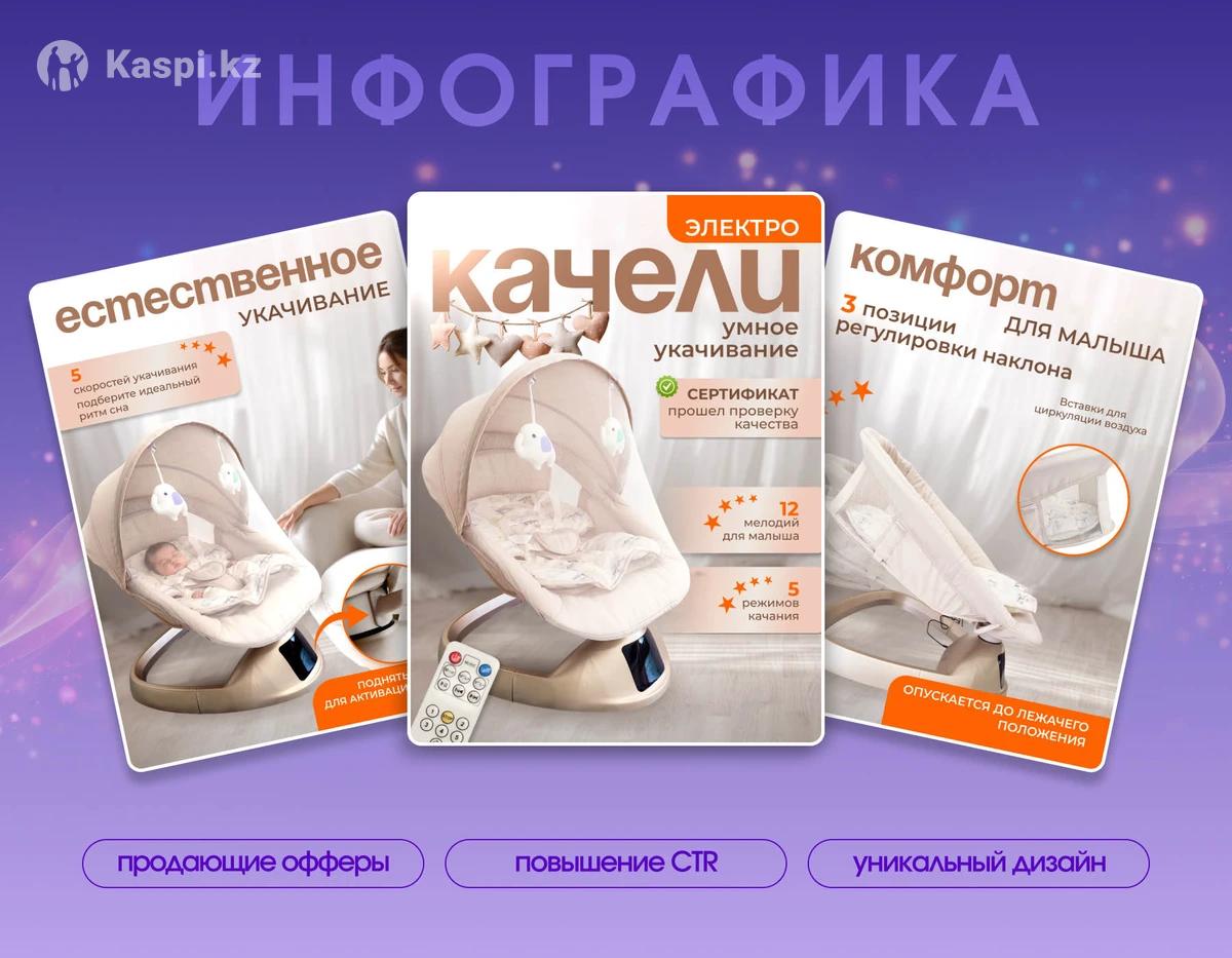 Создаю уникальные карточки товара для Wildberries, Ozon, Kaspi, Amazon, которые помогут вам выделиться среди конкурентов. Выполняю работу в сроки, внимательна к деталям. Что входит в услуги: 1. Анализ конкурентов и целевой аудитории 2. Проработка воронки продаж 3. Составление продающих офферов 4. Разработка уникального дизайна 5. Примерка в выдаче Что нужно от вас: 1. Фото товара в хорошем качестве 2. Техническое задание Стоимость услуг: Обложка карточки товара (главный слайд) - 3000 тг Каждый дополнительный слайд - 2500 тг Для заказа пишите на по номеру, указанному в объявлении. Приступаю к работе после предоплаты 50%.