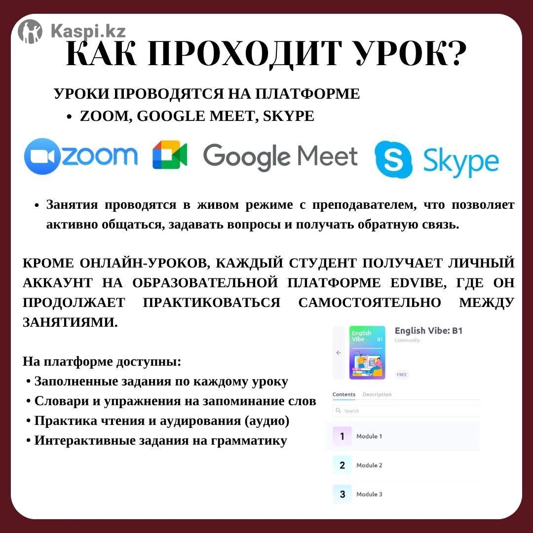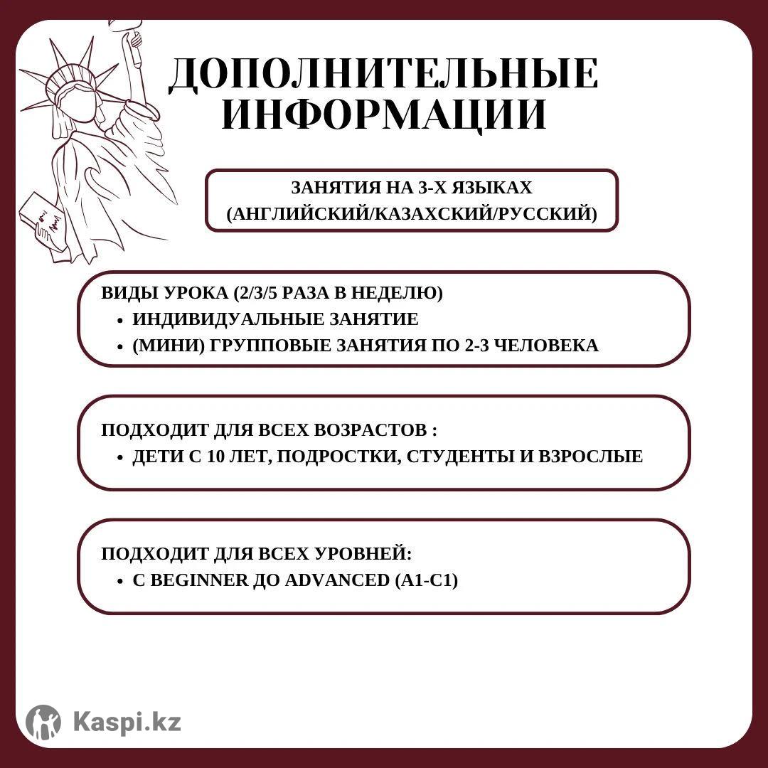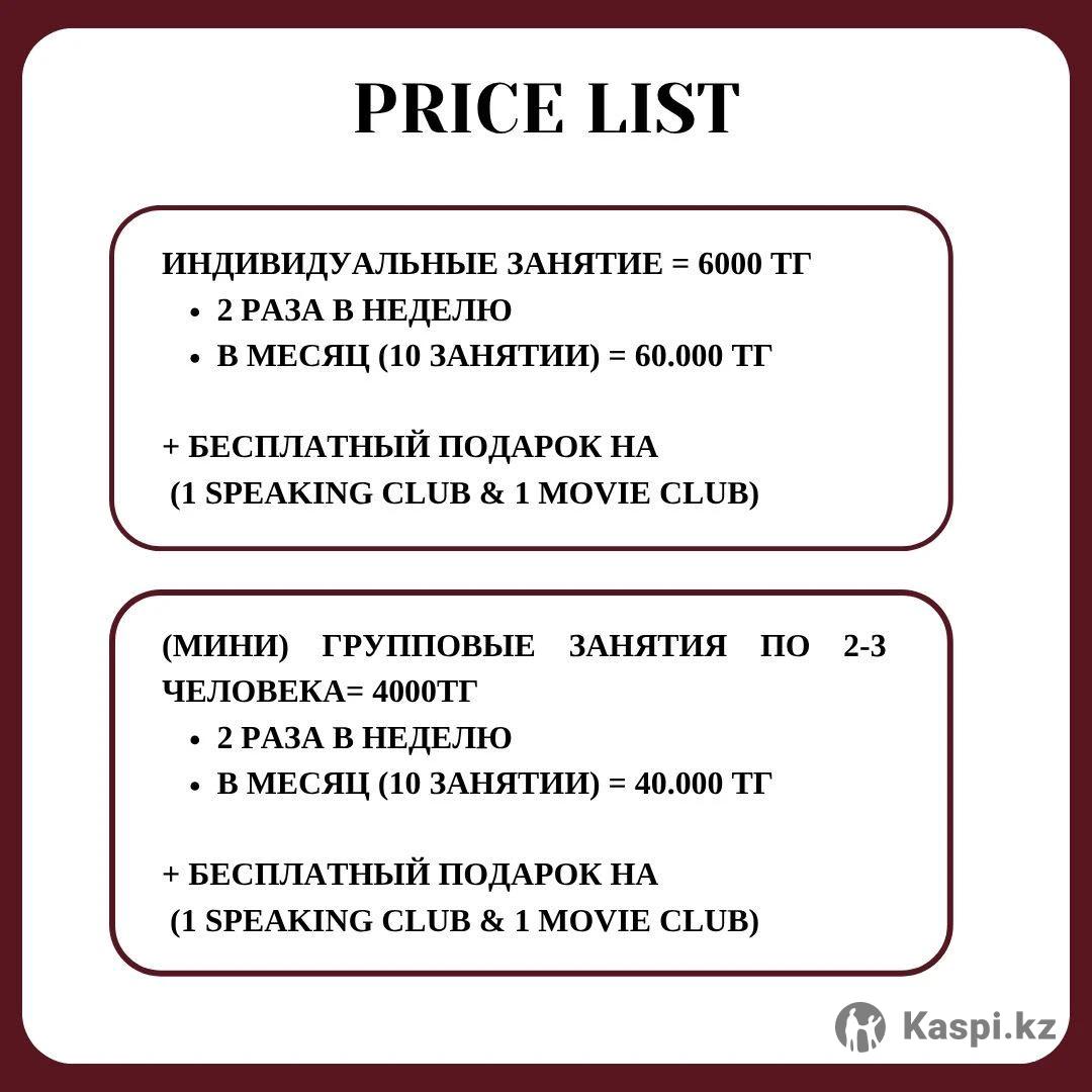 🇬🇧 Интенсивный курс английского языка от преподавателя международного уровня Мечтаете свободно говорить на английском, понимать носителей и чувствовать уверенность в общении — на работе, учёбе или путешествиях? Я помогу вам достичь этой цели быстро, эффективно и с удовольствием! Немного обо мне: Меня зовут Салтанат Абдиева, я — преподаватель английского языка с международным образованием и опытом работы более 5 лет. 🎓 Выпускница University of Bologna (Италия) и Vytautas Magnus University (Литва) — обладатель европейского двойного диплома. 🌍 Победитель международных программ — Leadership Program (Саудовская Аравия) и Change the World MUN (ОАЭ). 📚 Прошла курсы в Stanford University и Kennesaw State University (США). ✨ За годы преподавания я обучила 200+ студентов из разных стран — от Казахстана и Турции до Италии и Южной Кореи. Мои ученики уже свободно общаются, работают и учатся за рубежом! Почему выбирают мои курсы: Авторская методика: результат — с первых занятий Развитие всех навыков: Speaking, Listening, Reading, Writing Живые и современные уроки: фильмы, диалоги, песни, разговорная практика Удобный формат: индивидуальные онлайн-занятия (Zoom, Teams, Meet) Гибкий график: подбираю расписание под ваш темп и цели 🔥 Пробный урок — БЕСПЛАТНО! 💰 Стоимость индивидуального занятия — всего 6000 тг 📩 Записывайтесь прямо сейчас и начните говорить по-английски уверенно и красиво!