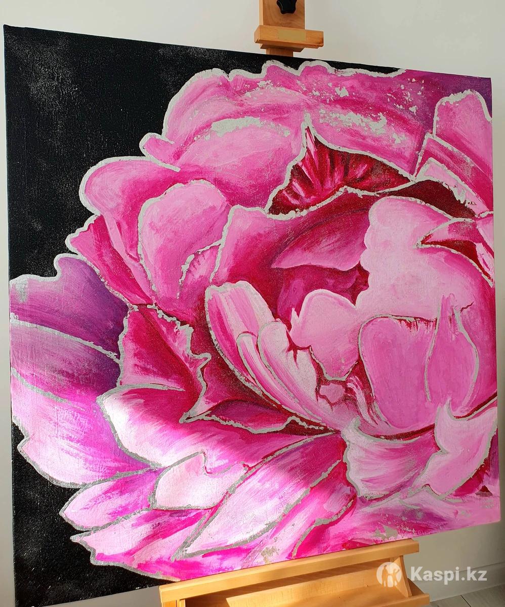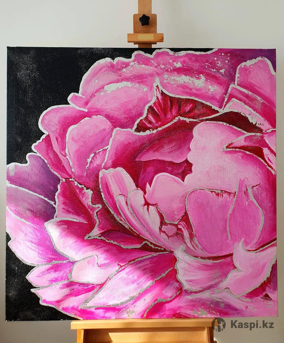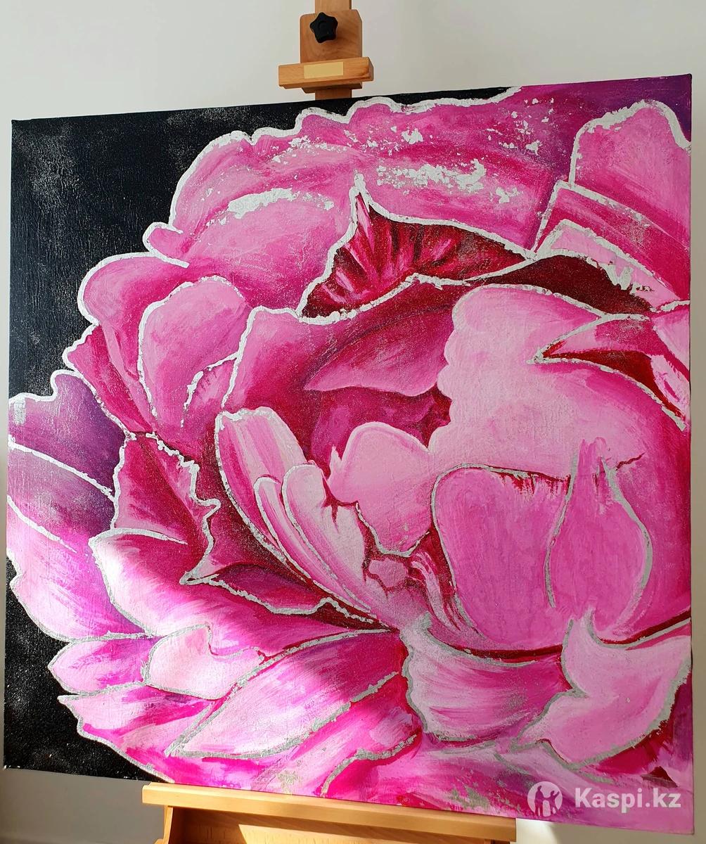 Интерьерные картины Ручная работа "Рeonies" живопись Акрил Поталь серебро размер 100×100