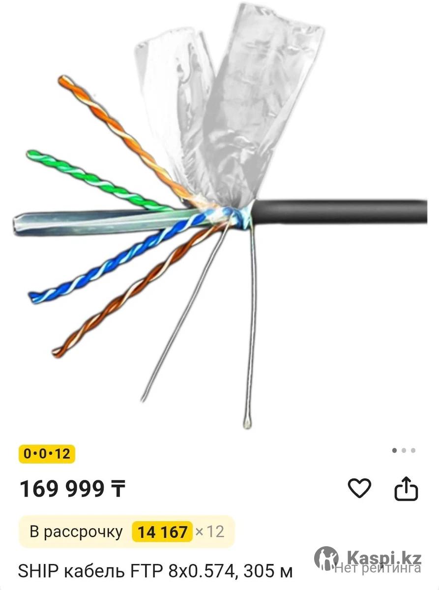 Продам кабель для Интернета, камер, сети итп кабель FTP cat (как UTP только мощнее). Специально сделан для проводки кабеля по улице, с дополнительным экраном. Жилы толще. Намного живучее и надёжнее простого кабеля для интернета UTP 5cat. На Каспи стоит 557тг за метр. Продаю почти в 3 раза дешевле. 260метров за 50тыс тенге