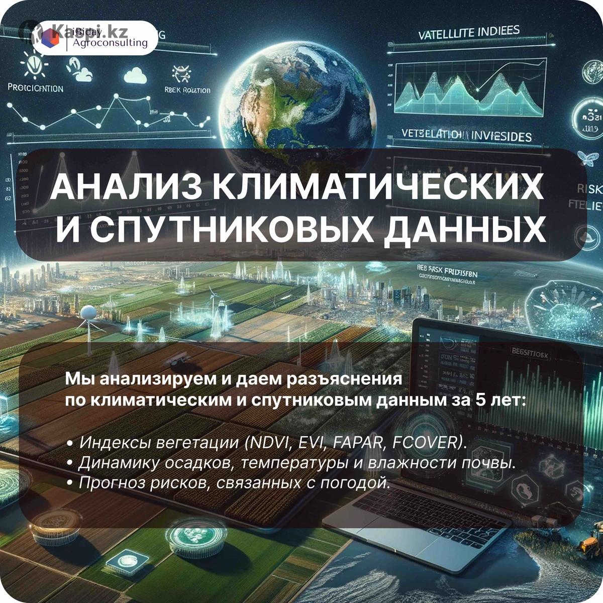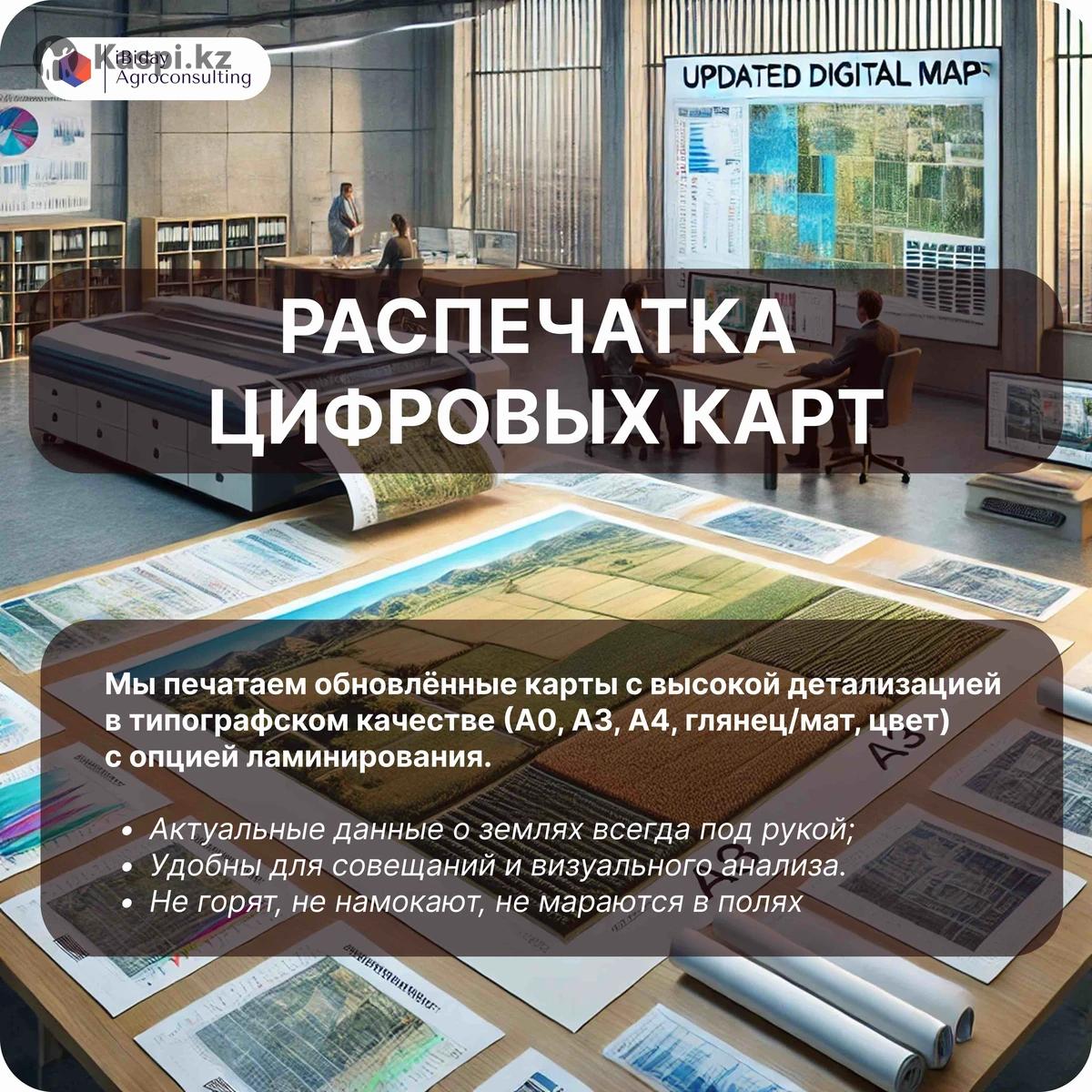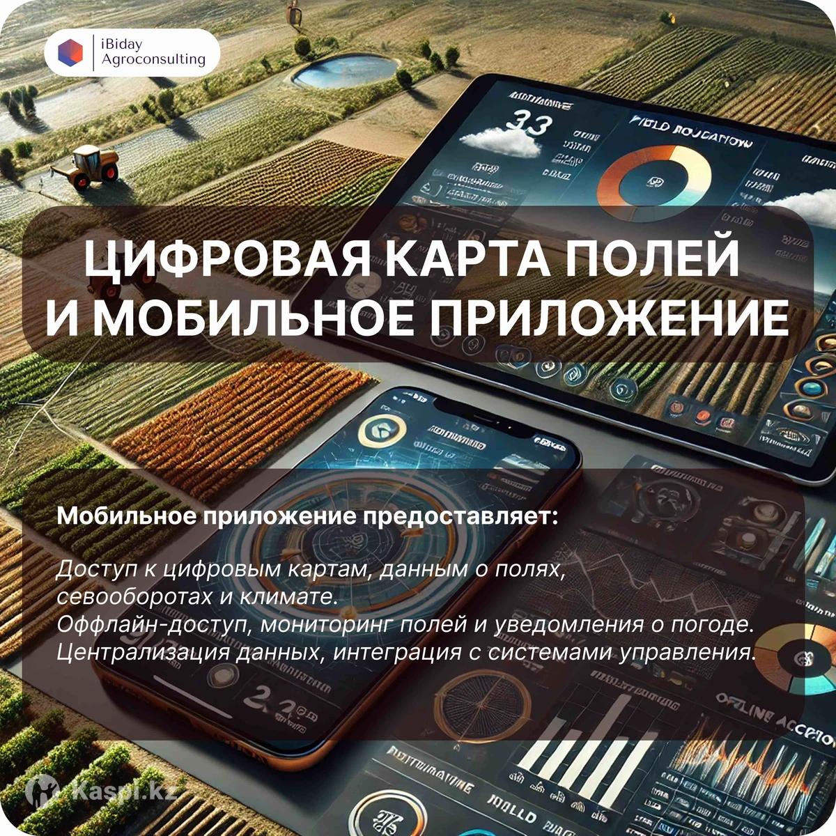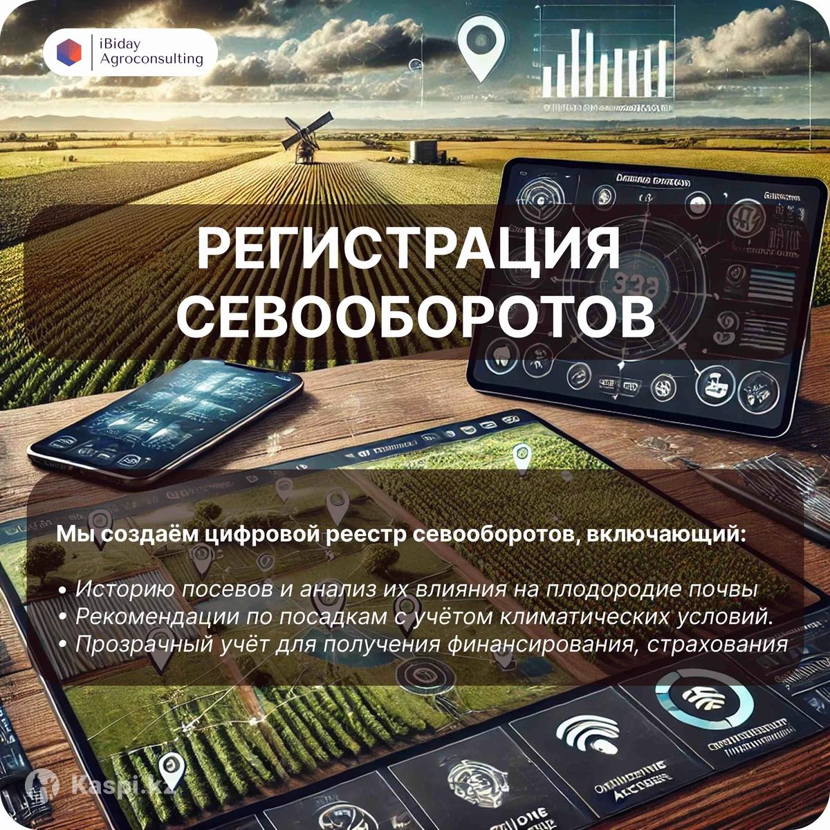 1. Оцифровка земель с использованием спутниковых снимков и GPS на портале 🛰️📍 Услуги: •🗺️ Определение границ и площадей полей (точность 0,5–1,5 м/пиксель). •🌲🌊 Выявление неиспользуемых территорий (лиманы, леса, озера). •☀️🌧️ Анализ спутниковых данных и климата для полной картины по полям. •🖥️ Создание цифровой карты хозяйства с детализацией участков. •📑 Актуализация данных в земельных реестрах. •🖨️📄 Печать карт в форматах А4, А3, А0 (3 копии каждого). •📱🧭 Доступ к мобильному приложению для офлайн-навигации. 2. Регистрация севооборотов на портале 🌾📊 Услуги: 1.Создание плана севооборота: •🌱 Учет агротехнических требований и климатических условий. •📈 Оптимизация для повышения урожайности и сохранения почвы. 2.Интеграция с производством: •💾 Регистрация данных в удобном цифровом формате. •🗺️ Интерактивные карты для управления севооборотом. 3.Работа через •💳 Быстрая регистрация и интеграция с финансированием (карбоновые кредиты). 4.Скорость и точность: •⏱️ Своевременное выполнение. •🔄💡 Данные доступны для управления в режиме реального времени. 🚩ЦЕНОВАЯ ПОЛИТИКА: Стоимость услуги зависит от площади пашни: 1.1000–5000 га: 150 тг/га га: 130 тг/га 3. га: 120 тг/га 4. га: 110 тг/га 5. га: 90 тг/га 6. га: 80 тг/га 7. га: 70 тг/га 8. га: 60 тг/га 9.50000+ га: 50 тг/га. Например если площадь пашни вашей земли 2500 га, то стоимость будет (2500 га 150 тг) 375 000 тг.