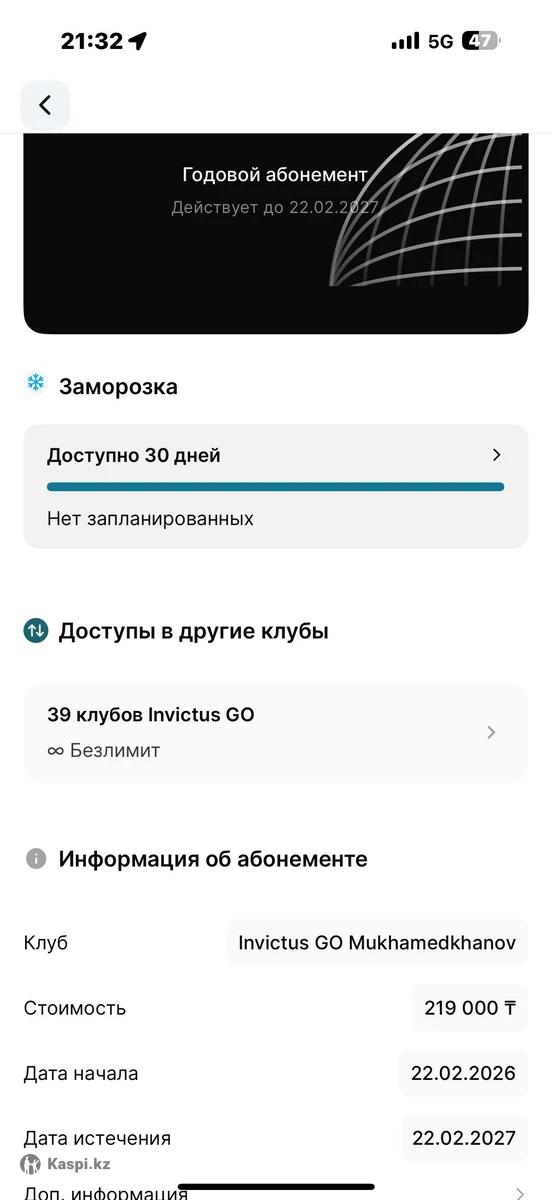 СРОЧНО продам почти новый годовой абонемент в Invictus GO. Дата начала: 22.02.2026 Дата окончания: 22.02.2027 Практически полный год впереди. Что входит в абонемент: • Доступ ко всем 39 филиалам • Безлимитное посещение зала • 30 дней заморозки • 3 гостевых посещения Переоформление официально через клуб. Стоимость переоформления оплачиваю я. Покупала за 219 000 тг. Отдам дешевле — 190 000 тг(небольшой торг) Или отдам за 170 000 тг переоформление будет 50/50