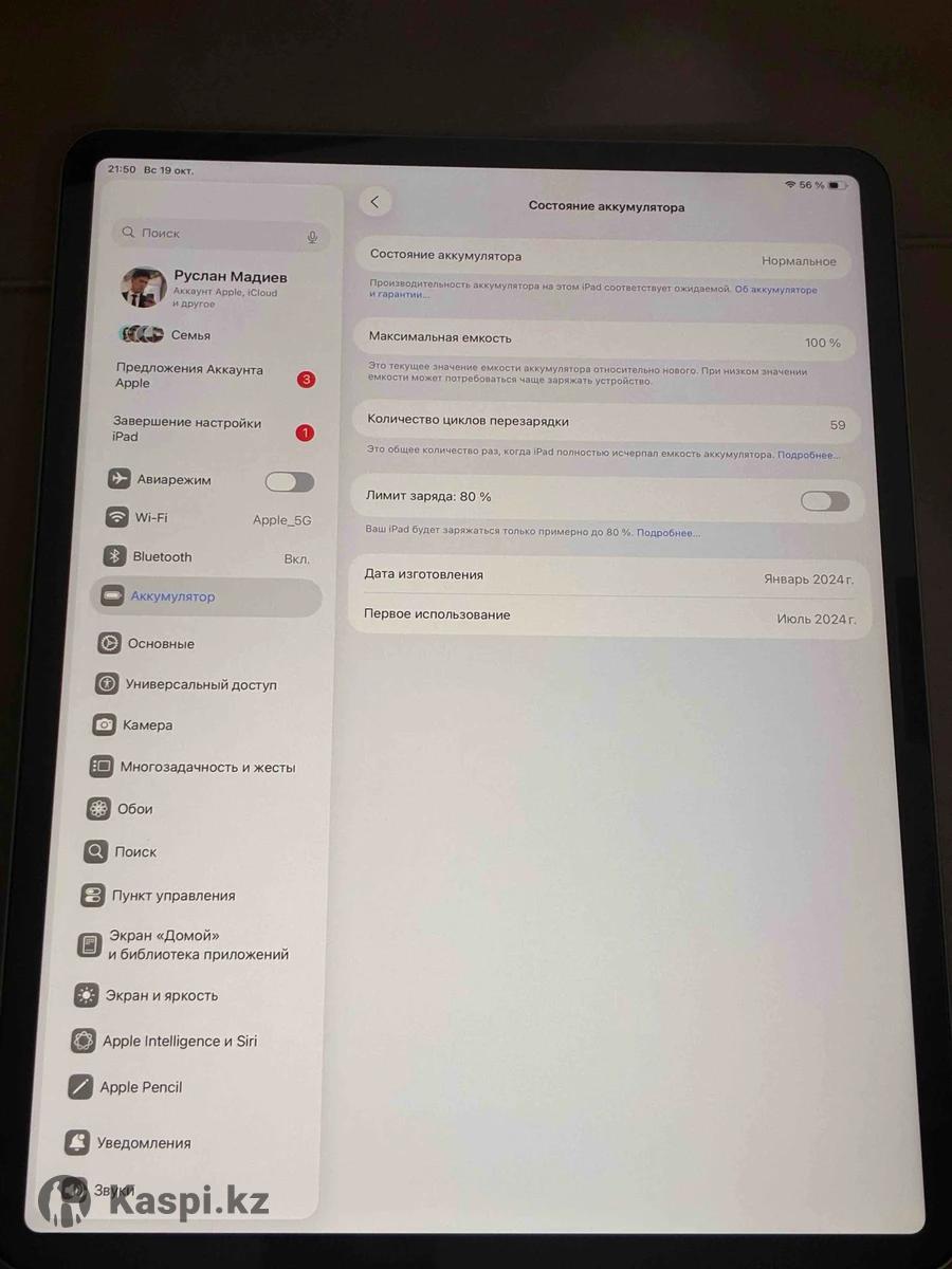 iPad Air 13 6 generation 256 Gb отличном состояние аккумулятор 100% 58 цикл. Коробка зарядное устройство все есть. Любая проверка