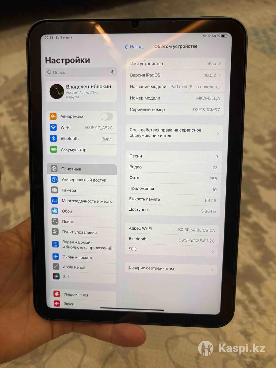 iPad mini (6-го поколения) — состояние как новый • Память 64 ГБ • Цвет Gray • Использовался мало • Нет царапин и вмятин • Никогда не ремонтировался • Никогда не вскрывался В комплекте: • Оригинальная коробка • кабель • Оригинальный чехол Характеристики и производительность: • Экран 8,3" Liquid Retina • Процессор A15 Bionic (Apple) • Быстрая и плавная работа • Поддерживает игры на высоких настройках • Подходит для видеомонтажа, обработки фото и многозадачности Другие особенности: • Лёгкий и компактный • Удобно брать с собой • Идеально для студентов, путешествий и повседневного использования