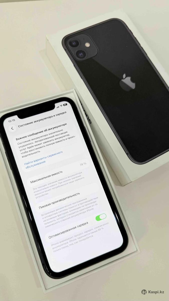 Продается айфон 11 64гб черный Аккумулятор 74% Куплен был в 2024/25 году С коробкой но без зарядки Мелкие царапины потертости по телефону В ремонте еще не был Все отлично работает звук, фейсайди,камера все Продаю так как купила новую Стоит новое обе 26.2.1 Пишите на