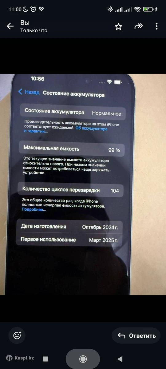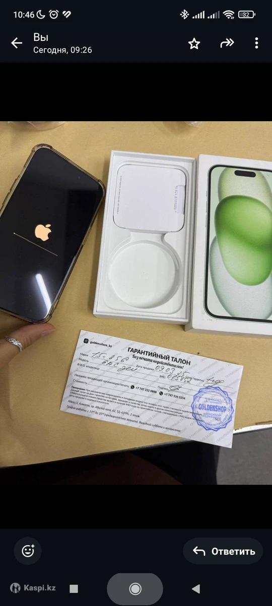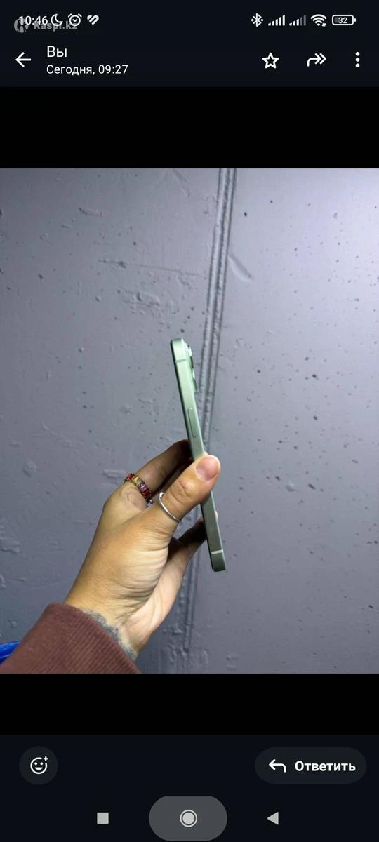 Продам iPhone 15, на 256 Гб, батарея 99%, в ремонте не был, идеальное состояние, пользовались пол года, потом просто лежал, так как подарили новый, гарантия еще действует до 9 марта, коробка есть, цвет зелёный. С iCloud вышли, не звонить, только писать пожалуйста , торг уместен