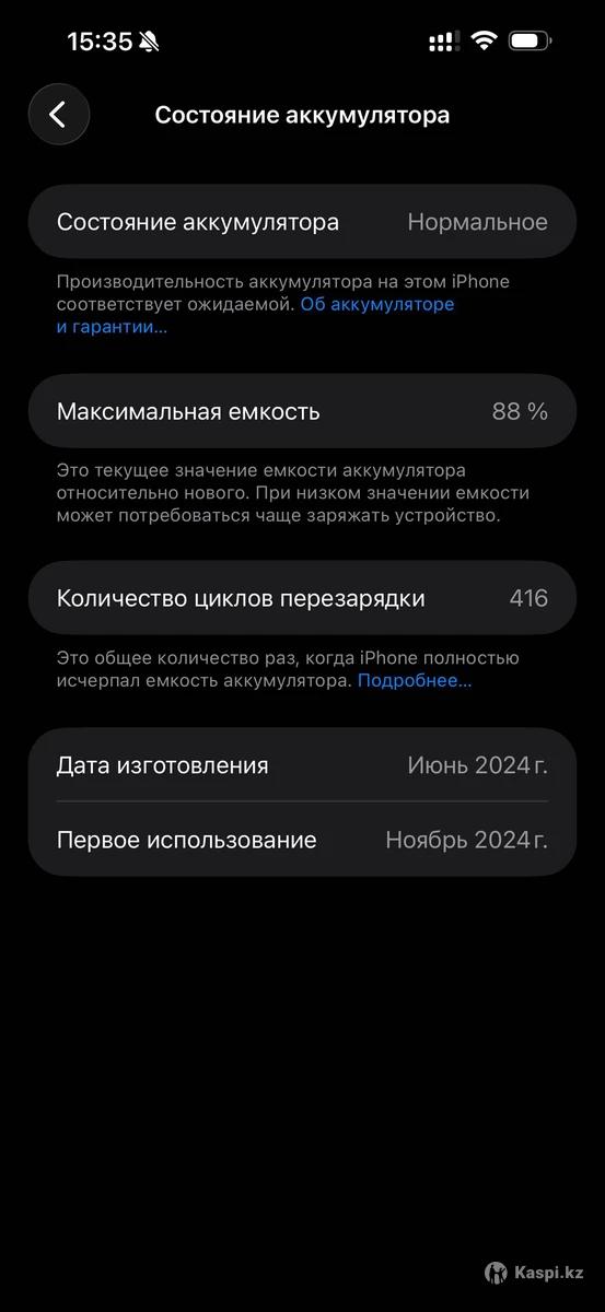 Дата покупки: 1 ноября 2024 года Циклов зарядки: 416 Состояние аккумулятора: 88% Телефон в идеальном состоянии. С первого дня использовался в чехле и с защитным стеклом. Полностью исправен, работает без нареканий В ремонте не был В комплекте: коробка, оригинальный кабель, чек о покупке Торг минимальный Связь: : пишите)