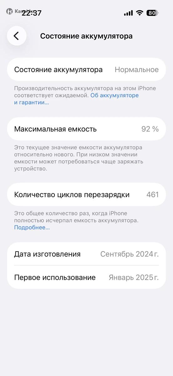 iPhone 16 128 gb 92% ( цикл зарядки 461) В комплекте: коробка, документы, шнур, адаптер, чехол 2 шт, защитное стекло Физическая сим-карта и е-sim Без сколов; без трещин; без царапин Все родное ничего не менялось Все функции работает отлично