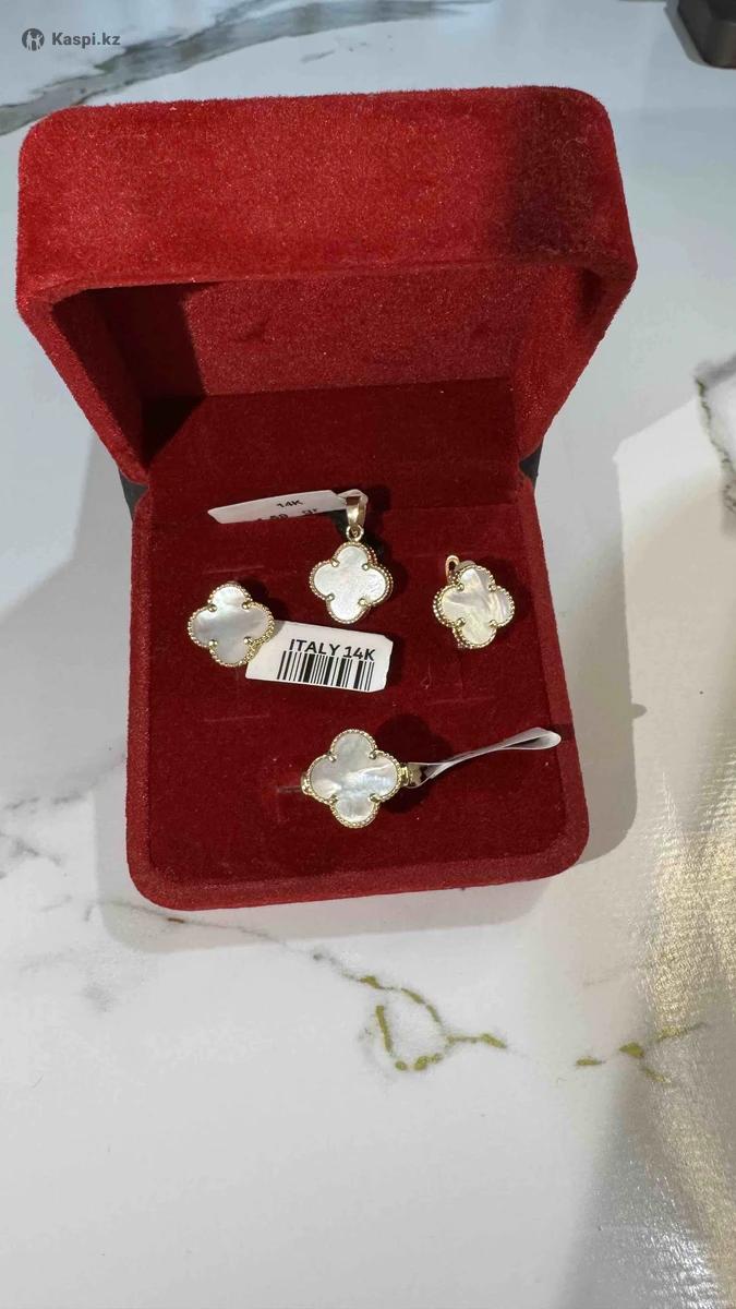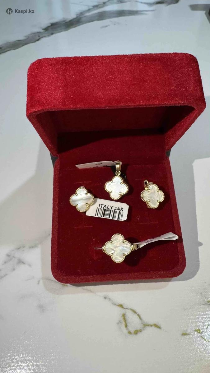 Комплект – ИТАЛИЯ 14К Нежный и элегантный дизайн с перламутром в форме клевера — символа удачи и изящества. Проба: 14K (Italy) 585 Состав комплекта: – Кольцо – 2.36 гр – Серьги – 3.65 гр – Подвеска – 1.59 гр общ 7,6гр Идеально подойдет как для подарка, так и для себя любимой.