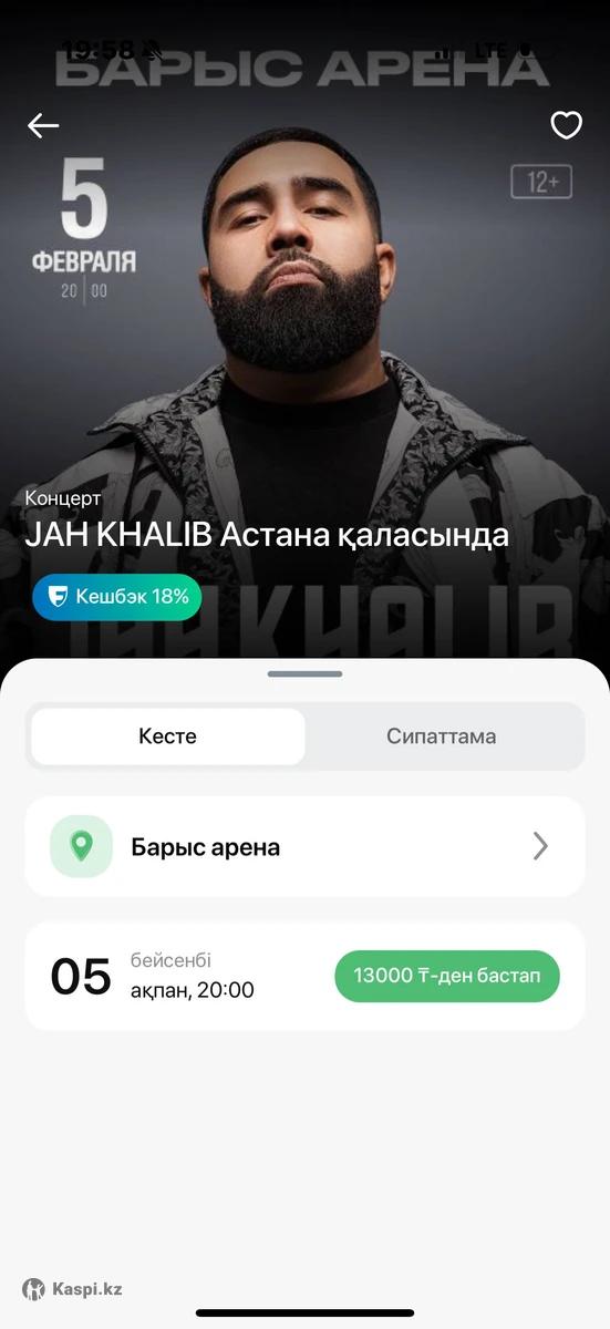 Город Астана есть 1 билет на концерт Jah khalib 05.02.2026 продаю потому что не могу пойти по каким то причинам, а билет не принимают к возврату. цена 20 тысяч