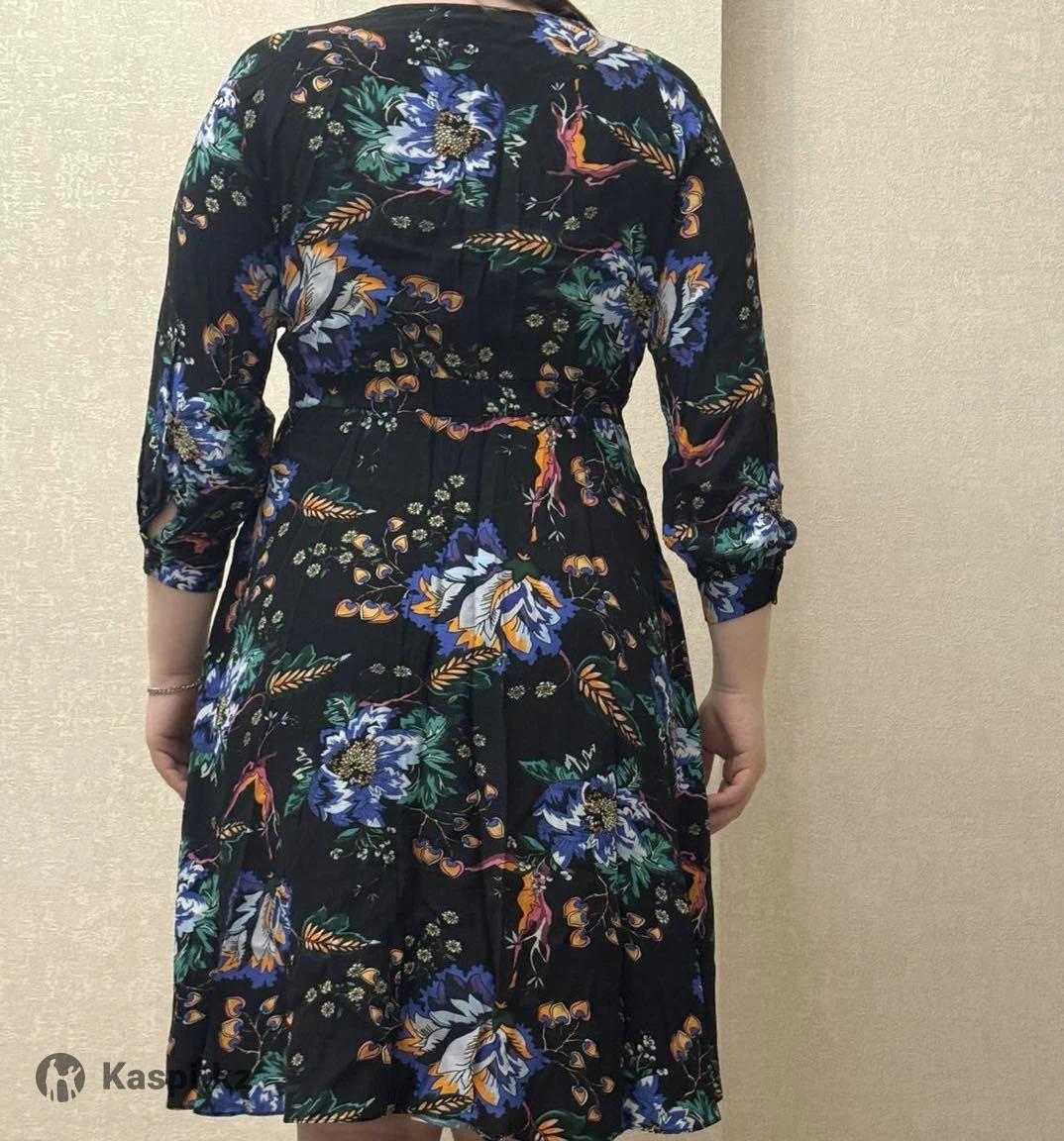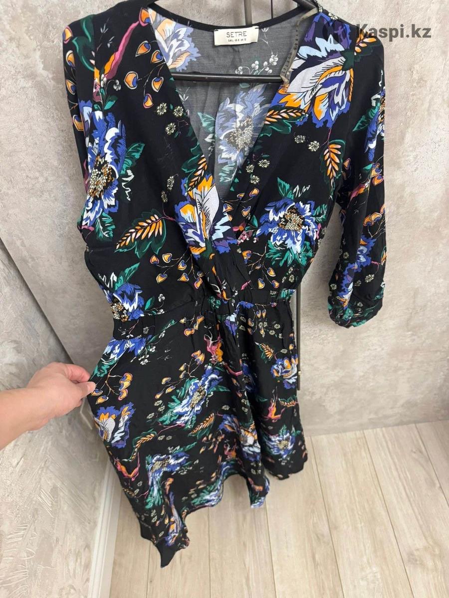 Платье женское SETRE Цвет: черный, цветочный принт Длина: миди Рукав: 3/4 Вырез: V-образный (на запах) Посадка: приталенное, резинка на талии Материал: легкая ткань Стиль: повседневный / нарядный Состояние: отличное Торг уместен Подходит для прогулок и мероприятий.
