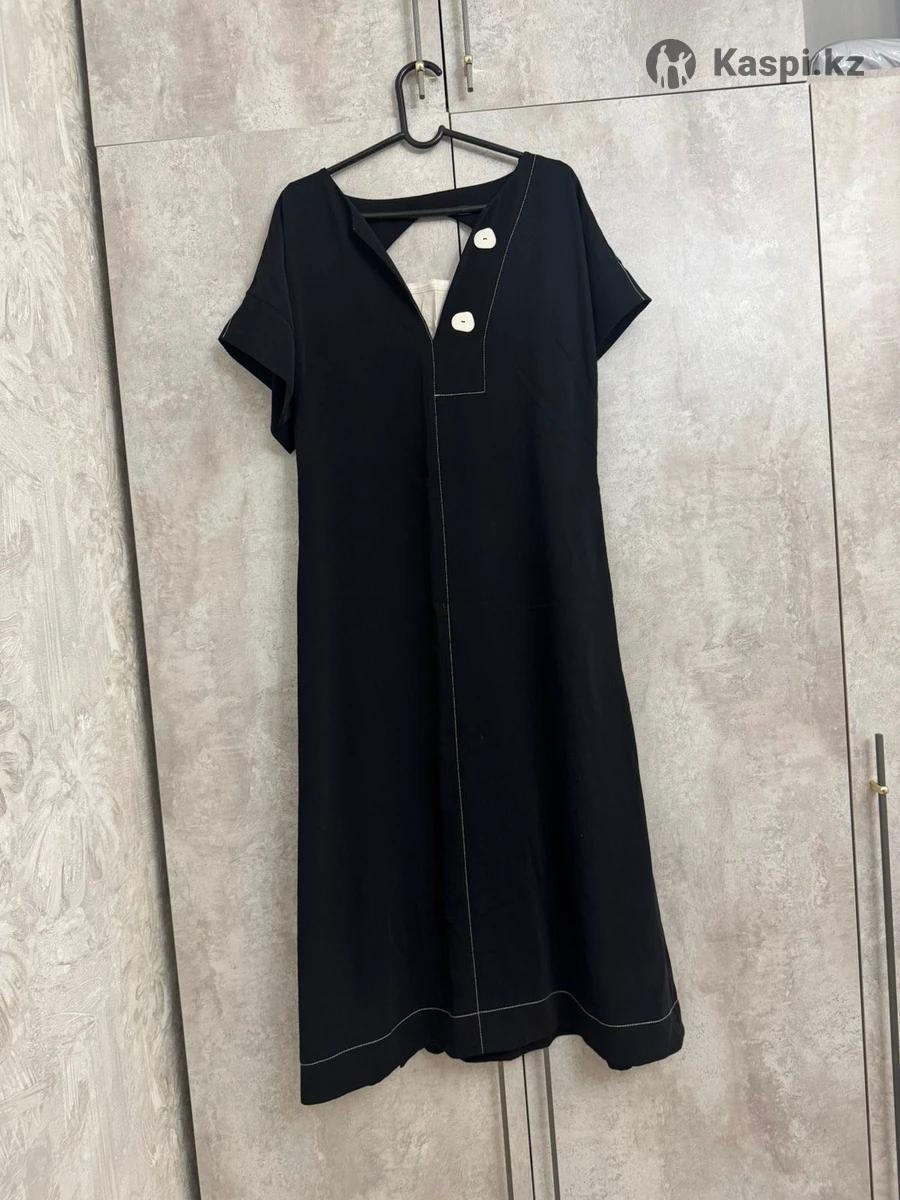 Стильное черное платье. V-образный вырез с декоративными пуговицами, короткий рукав, аккуратная контрастная строчка. Универсальный вариант для работы и повседневной носки. Комфортное, легко сочетается с любой обувью. Отличное состояние. Фасон: прямой Рукав: короткий Вырез: V-образный Цвет: черный Стиль: повседневный / офисный Состояние: отличное