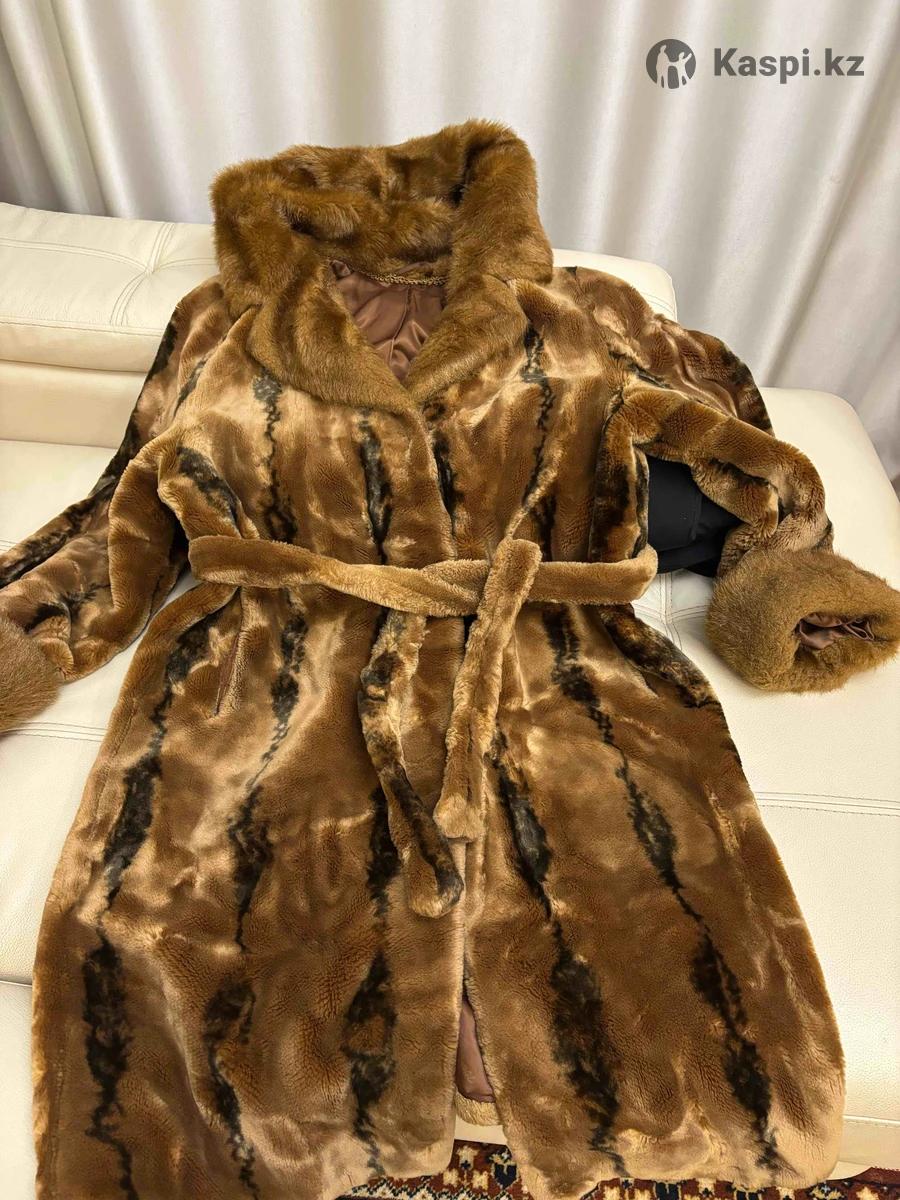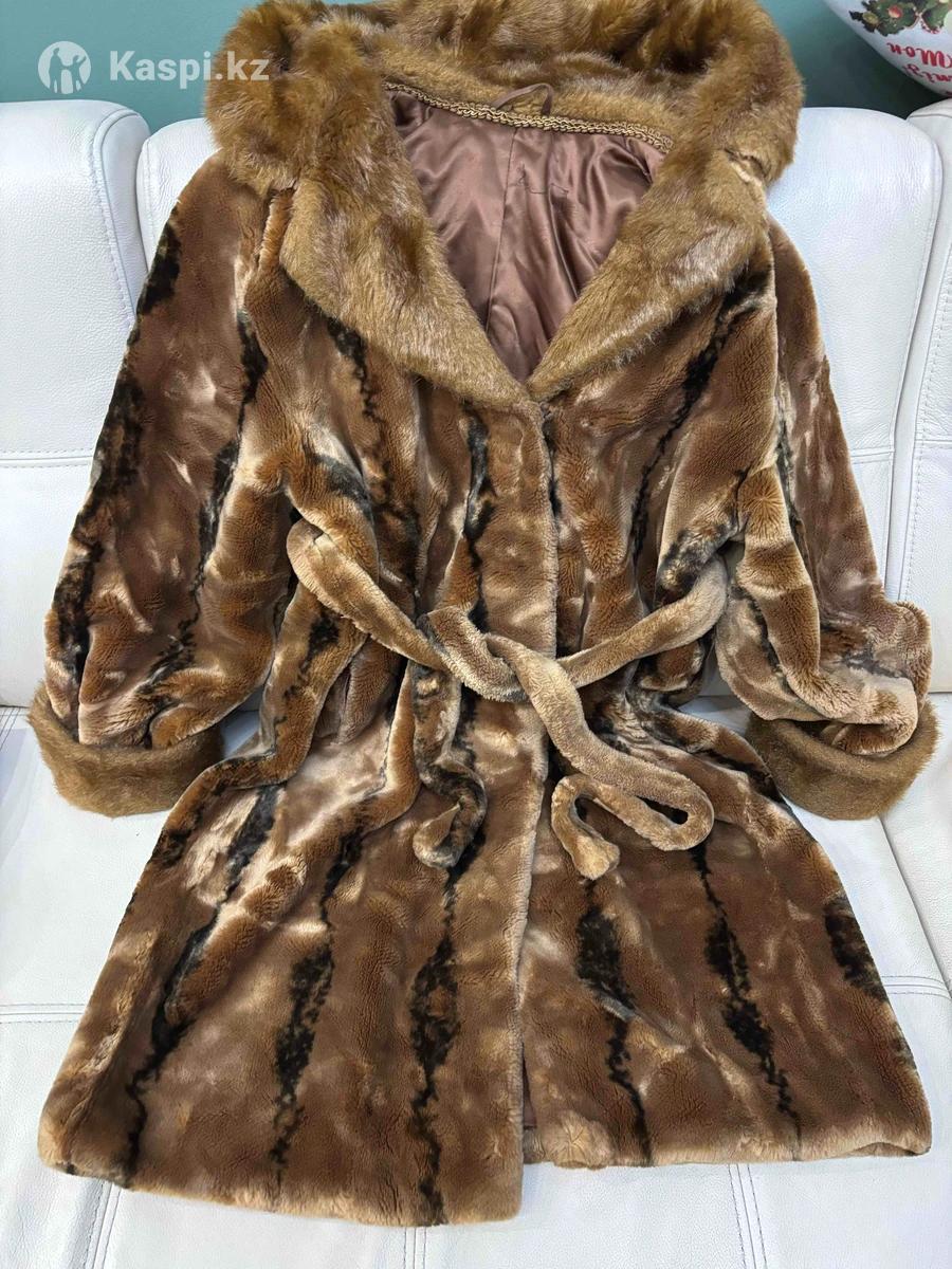 Красивая шуба с капюшоном, искусственный мех средней длины, с поясом в хорошем состоянии
