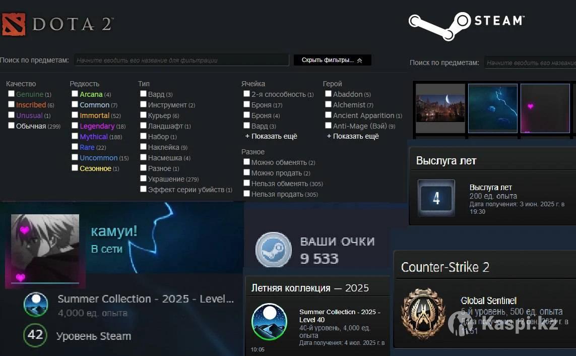 Личный жирный аккаунт, 42 лвл стим с красивым оформлением профиля dota 2: 8161 ммр, 6992 часов, куча шмоток (4 арканы, 52 имморталки, легендарки/коллекторки/личности, все на скринах), высокие тиры на героях (на скринах), 89 трофей, варды/курьеры. Все шмотки закреплены на аккаунте (нельзя передать/продать/подарить) cs 2: глобал в напарниках, премьер не откалиброван (закидывает на 20-25к), 456 часов. Вечная гарантия на пользование аккаунтом после его покупки, пишите, отвечаю сразу, торгану