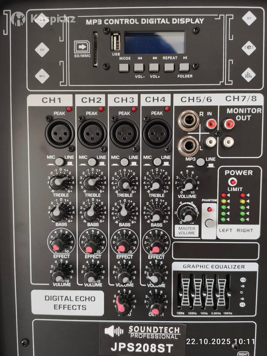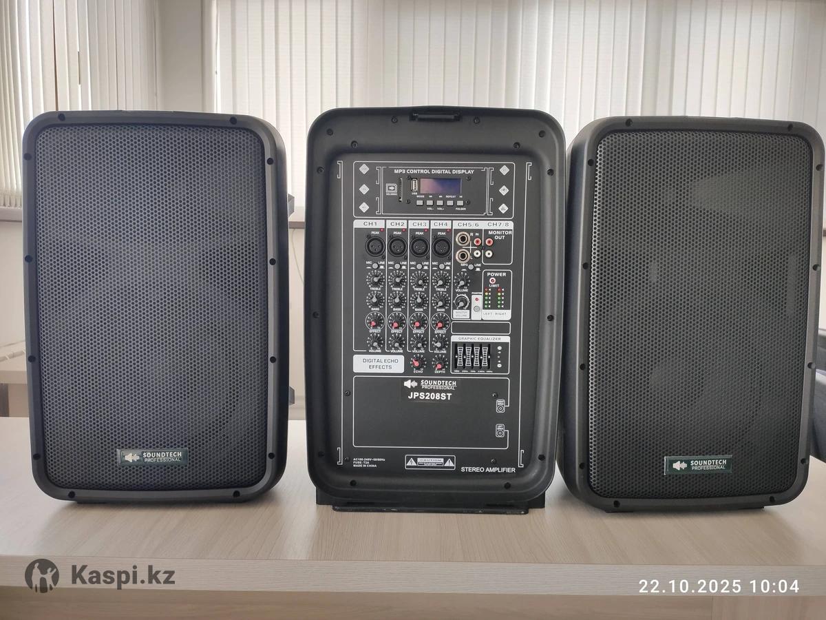 Брали для мероприятия, пользовались мало Профессиональный стереофонический 4-канальный микшер с двумя динамиками 8 дюймов, 2-полосная акустическая система 800 Вт, комбинированна система DJ/PA , портативная PA-система с микрофоном, штативами, пультом дистанционного управления, входами USB, SD-карты, RCA и 1/4 дюйма - Пластиковый корпус динамика - 2 шт. 8-дюймовый портативный динамик 1 шт. Активный стерео микшер - Портативные 2-полосные полно диапазонные динамики с активным микшером - Максимальный уровень звукового давления 110 дБ пиковый Диапазон частот (-10 дБ) 60 Гц - 20 кГц - Частотная характеристика (+/-3 дБ) 70 Гц - 18 кГц - Вход переменного тока 100-120 В, 220-240 В 50/60 Гц - Конструкция усилителя Класс D Номинальная мощность системы 300 Вт (2 x 150 Вт стерео) - Выходной разъем 2 x 1/4" TS (несимметричных) выхода усилителя Каналы 1-4: разъемы XLR 5-6: одна пара 1/4" сбалансированных разъемов TRS (стерео) 7-8: одна пара 3,5-мм стерео разъемов Эквалайзер высоких/низких частот Фильтры верхних и нижних частот для каждого канала; срез +/- 12 дБ и Система усиления - Ограничитель Встроенный DSP-ограничитель - НЧ-динамик 1x JPS 208 8" (203 мм) НЧ-динамик ВЧ-динамик 1x 1" рупорный драйвер - Частота кроссовера 2 кГц Корпус - Полипропиленовые ручки - Одна сверху Решетка динамика Перфорированная сталь с порошковым покрытием - Аксессуары: 2 кабеля динамика (несбалансированные) 3 м, 2 штатива (1,2 м), 1 кабель питания, 1 провод микрофона