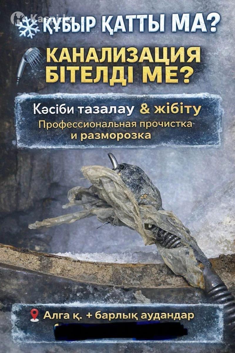 Арнайы аппаратпен канализация трубасын тазалаймыз 50 м дейін. Прочистка канализации до 50 м специальным аппаратом.
