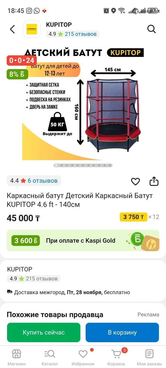 Продам каркасный батут в отличном состоянии до 50кг, цена окончательная покупали за 45тыс продам за 20тыс район Космос(могу собрать, почти не пользовались) тел