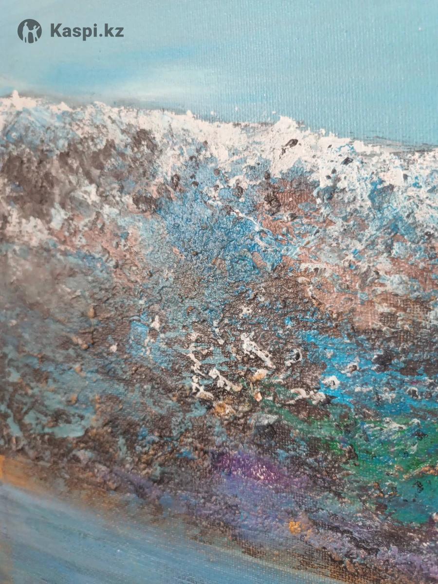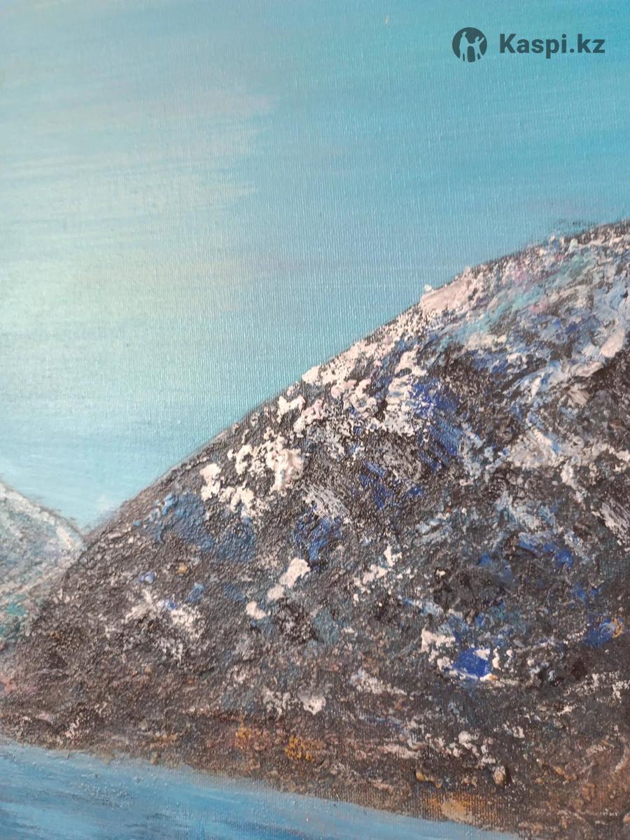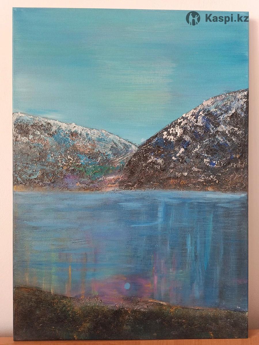 Акриловая картина покрыта лаком. Горное озеро. Высота 70. Ширина 50. Можно протирать. Качественная. Картина казахстанского писателя. Возможен торг. Картину хочется рассматривать. Для ценителей душевного искусства.