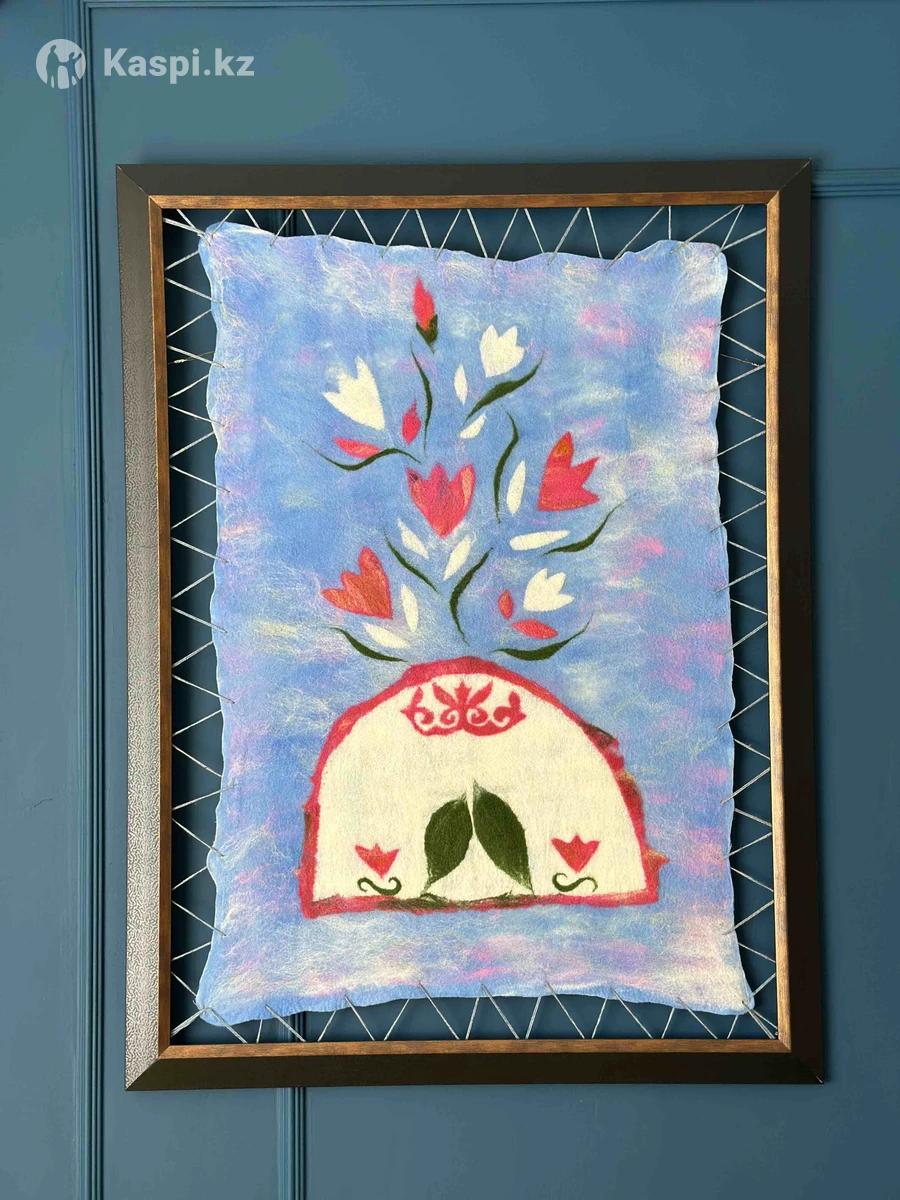 «Гүлденген шаңырақ» (Өлшемі: 105×80 см) Бұл киізден жасалған бірегей туындыны ерекше ықыласпен орындадым. «Гүлденген шаңырақ» – әр үйде, әр шаңырақта көктем мәңгі орнап, өмір гүлдері жайқалып тұрсын деген ниетпен дүниеге келді. Жұмыс табиғи киізден, мокрое валяние әдісімен орындалған. Картина рамкаға ерекше стильде керіліп, аспанда қалқығандай әсер береді. Бұл туынды – интерьерге жылу, ұлттық нәзіктік пен мағына енгізетін жалғыз данада жасалған өнер туындысы. Сатып алу үшін арқылы хабарласыңыз: +☎️