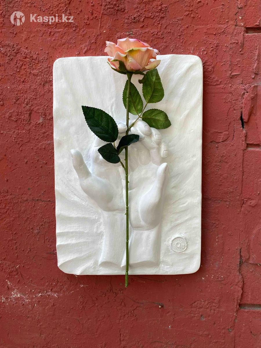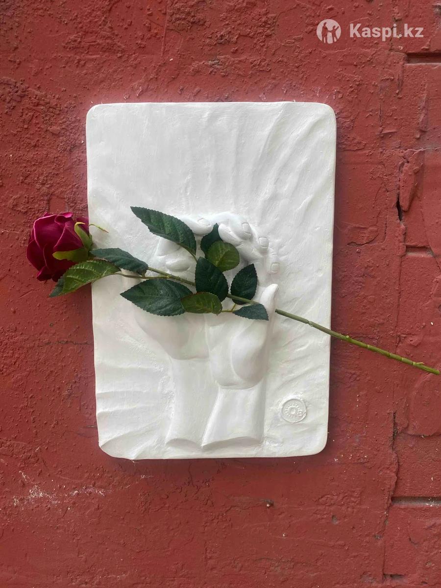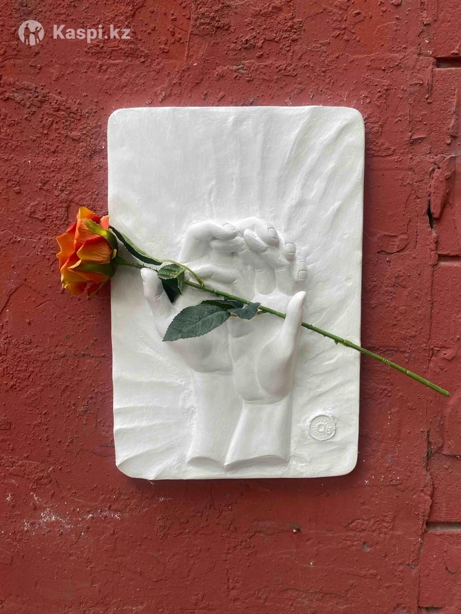Картина «Я и ты» рельеф из гипса и с искусственной розой. На картине изображена рука мужчины и женщины, которые на ладони вместе держат цветы. Сделаем фирменную упаковку+акция бесплатная доставка по Алматы. Размер:27х40см