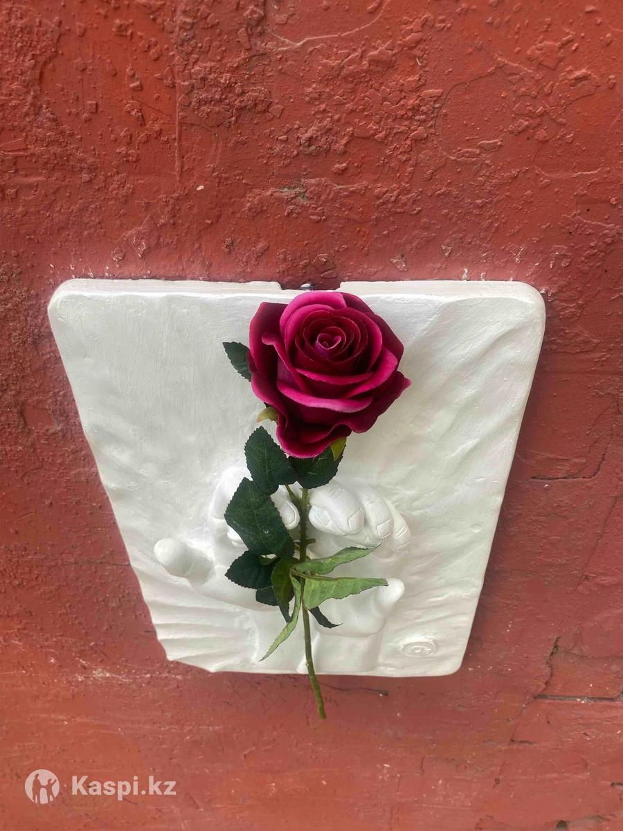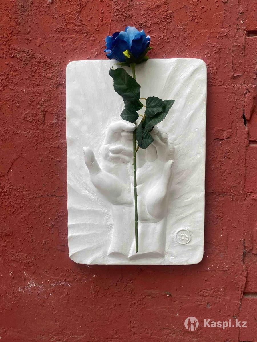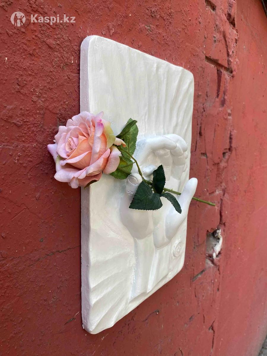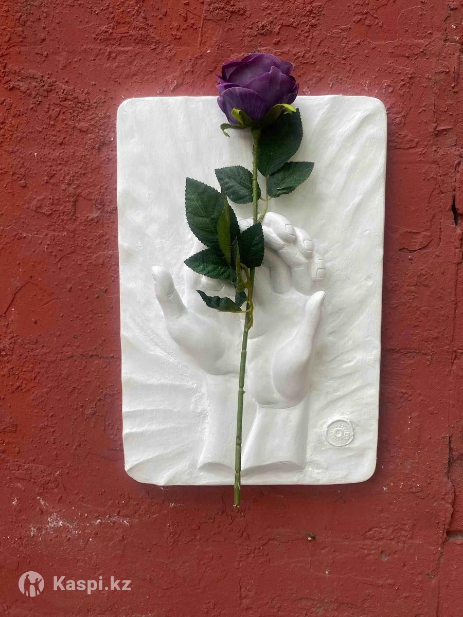 Картина «Я и ты» рельеф из гипса и с искусственной розой. На картине изображена рука мужчины и женщины, которые на ладони вместе держат цветы. Сделаем фирменную упаковку+акция бесплатная доставка по Алматы. Размер:27х40см