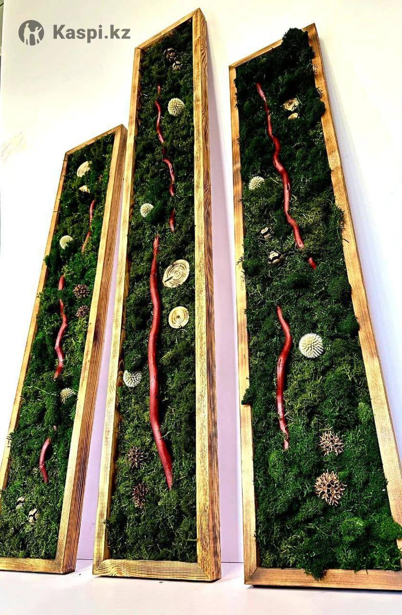 Панно из стабилизированного мха. Идеальный вариант для тех кто любит природу, но не занимается комнатными цветами. Мох обработан в специальном растворе, его не нужно поливать и опрыскивать. Никакого ухода он не требует. Сохраняет свой вид до 10лет, главное не ставить на открытых солнечных лучах и у обогревателей. 2картины-10020см 1-12020см Продаются все три
