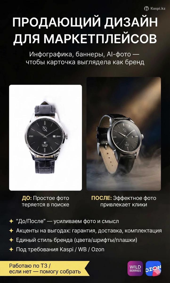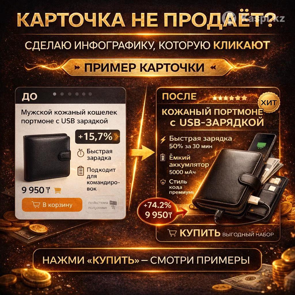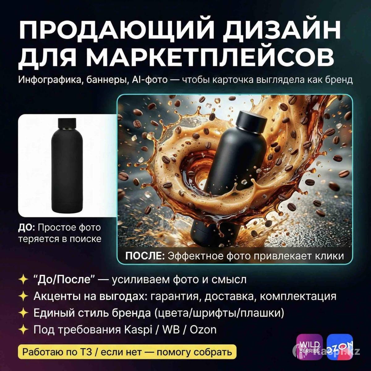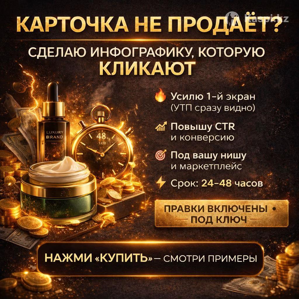Оформляю карточки товаров для Kaspi и маркетплейсов. Помогаю продавцам выделиться и выглядеть профессионально. Инфографика и AI-контент для бизнеса. Видео, баннеры, сайты и приложения. Цена от 2 000 тг. Создаю инфографику и AI-контент для бизнеса, а также видео, сайты и приложения под ключ. Помогаю бизнесу и продавцам маркетплейсов оформить визуал так, чтобы он выглядел современно, привлекал внимание и выделялся среди конкурентов. Что я делаю: • Инфографика и карточки товаров • Карточки товаров для Kaspi, Wildberries, Ozon • AI-изображения и визуальный контент • Видео-контент (Reels, Shorts, рекламные видео) • Баннеры и рекламные креативы • Сайты и лендинги для бизнеса • Приложения и цифровые решения (MVP, бизнес-проекты) • Контент для Instagram и Как работаю: • Быстро и под ключ • Современный стиль с использованием AI • Адаптация под требования маркетплейсов • Единый визуальный стиль • Индивидуальный подход под нишу и задачи Условия: • Цена — от 2 000 тг • Сроки — от 1 дня • Работаю удаленно по всему Казахстану Пишите или звоните — помогу сделать ваш бизнес визуально сильнее и современнее.