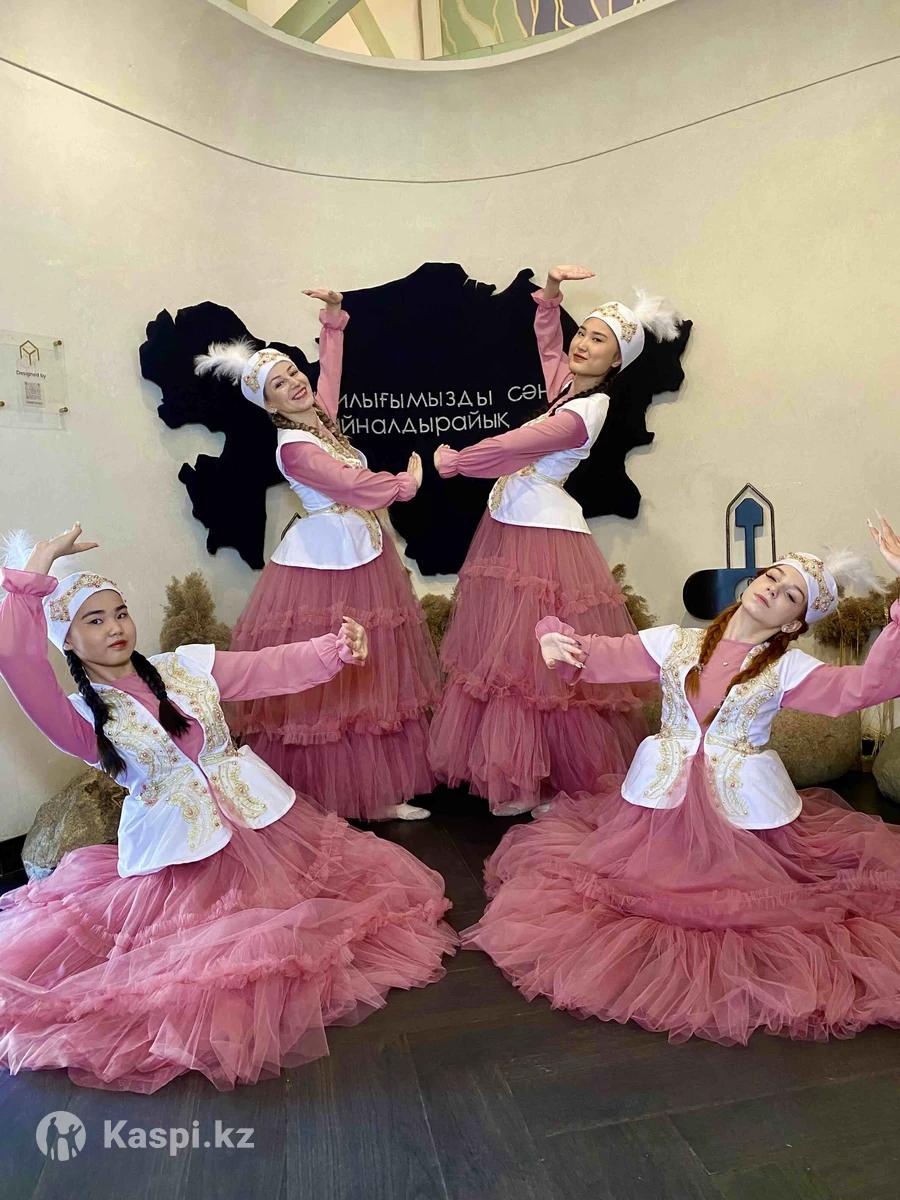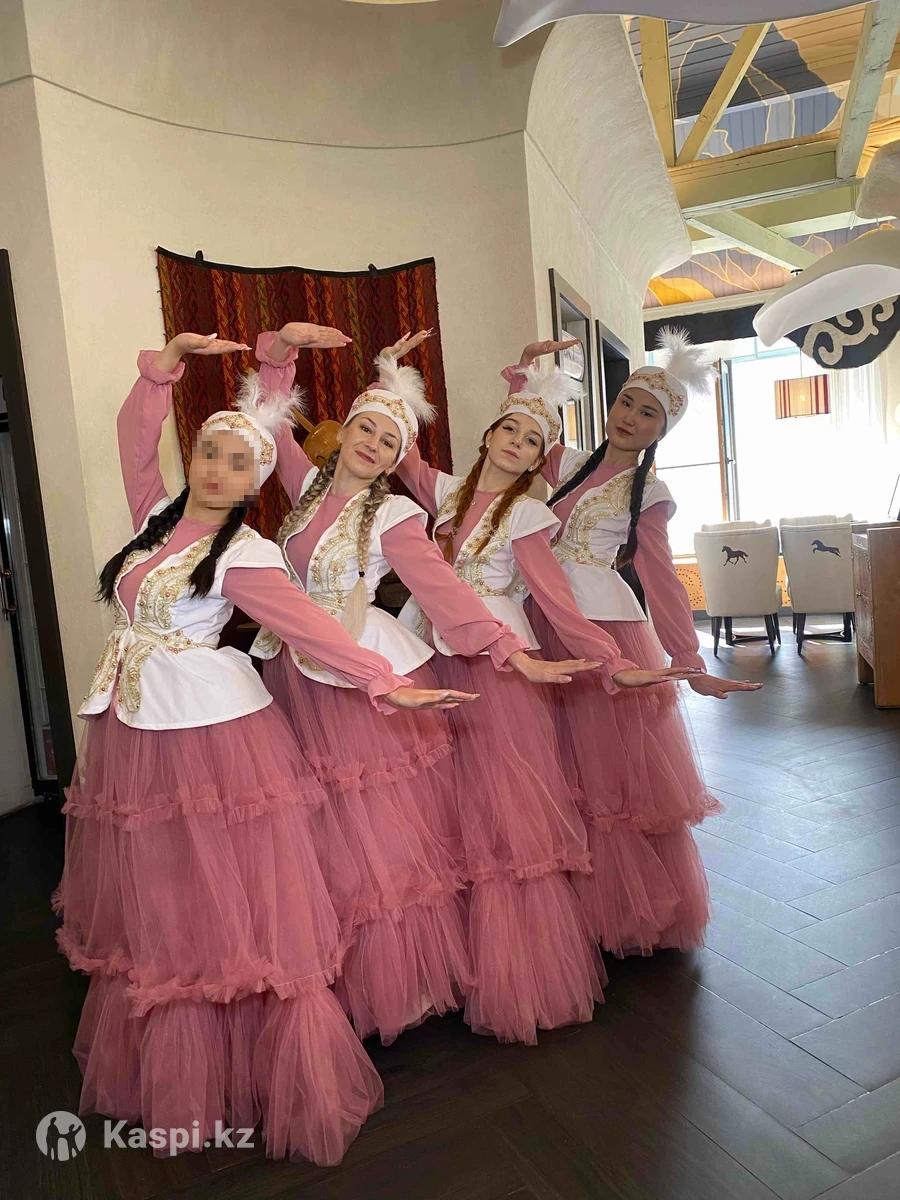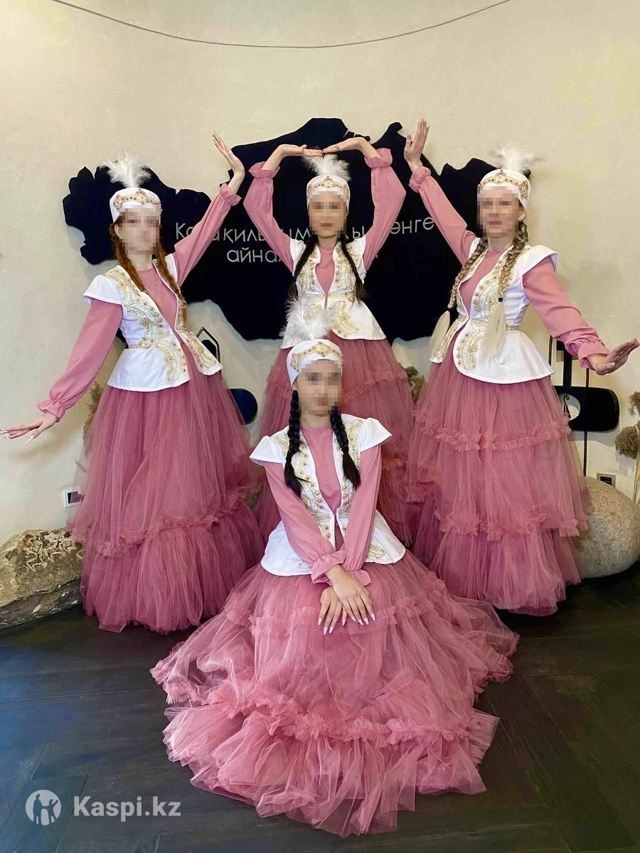 Продам красивые, нежные казахские костюмы для девушек, новые. В комплекте: 4 платья, 4 жилетки и 4 шапки с перьями.