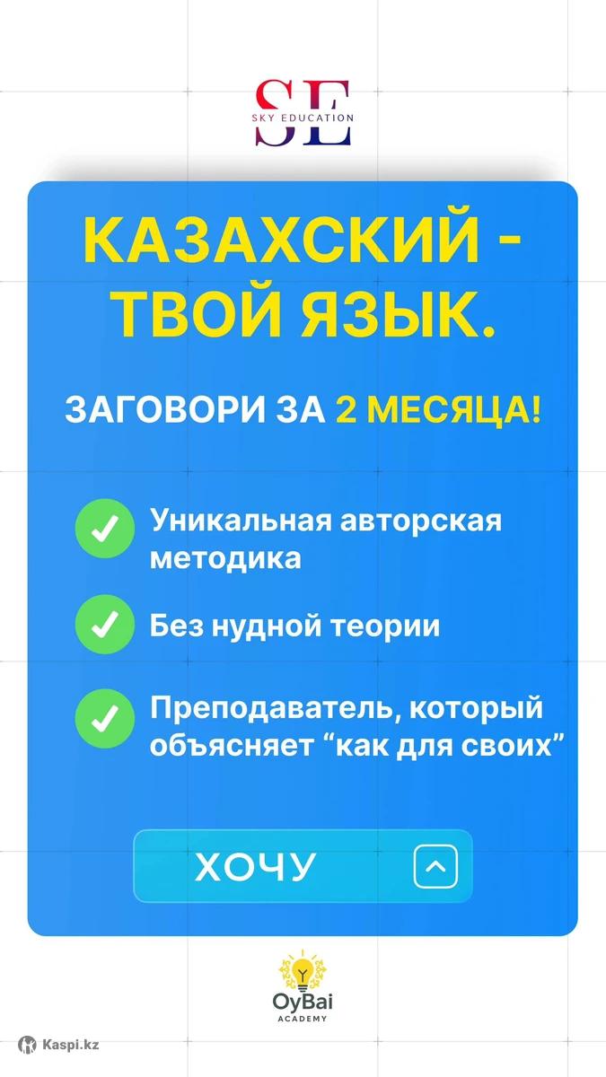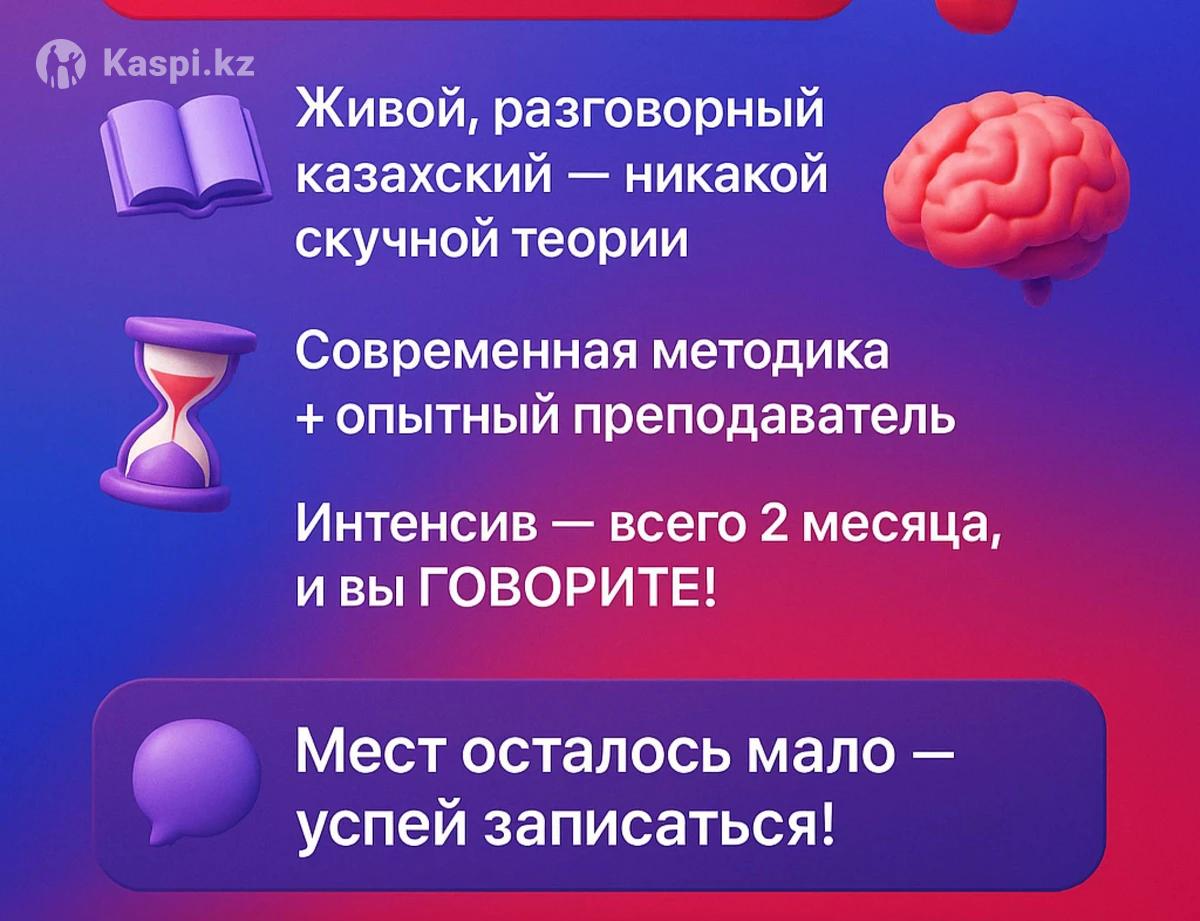 😊Курсы казахского в Алматы с мега эффективным преподавателем🔥, Абай автор собственной методики и программы! С нами Вы можете изучать казахский язык для: - работы, - учебы, - жизни. 📌 Уже на первом уроке Абай: уберет акцент, расскажет, как быстро заговорить на казахском, поделиться самыми важными темами для уверенного общения 👨🏻💻Преподаватель с опытом и инновационным подходом, без нудятины😁, минимум теории и больше практики. С Абаем вы начнете говорить правда быстро, проверено нашими учениками! 1️⃣ офлайн 2 раза в неделю по 60 минут, в группе до 6 человек, стоимость 36 000 тенге в месяц 2️⃣ онлайн 2 раза в неделю по 60 минут, в группе до 6 человек, стоимость 30 000 тенге в месяц.