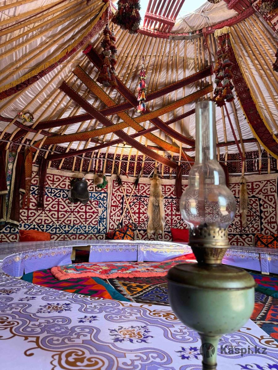 Қазақ үй, 6 қанат 8 қанат үйлер бар. Сүйегі ағаштан. Іші әдемі. Жер үстел көрпелерімен бар. Ыдыс аяқтың барлық түрі бар