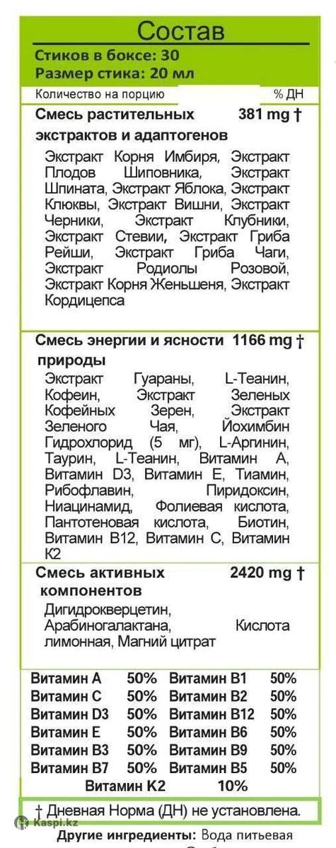 SUCCESS DAY – натуральный продукт, направленный на ● обогащение организма необходимыми питательными веществами на клеточном уровне, ● обладает тонизирующими свойствами, ● способствует увеличению энергии ● профилактика более 700 заболеваний и многое другое. ⠀ ✅ Состоит из; ➖ Смесь растительных экстрактов и адаптогенов: Количество 381 mg. Экстракт Корня Имбиря, Экстракт плодов Шиповника, Экстракт Шпината, Экстракт Яблока, Экстракт Клюквы, Экстракт Вишни, Экстракт Черники, Экстракт Клубники, Экстракт Стевии, Экстракт Гриба Рейши, Экстракт Гриба Чаги, Экстракт Родиолы Розовой, Экстракт Корня Женьшеня, Экстракт Кордицепса. ⠀ ➖ Смесь энергии и ясности природы: Количество 1166 mg. Экстракт Гуараны, L-Теанин, Кофеин, Экстракт Кофейных Зеленых Зерен, Экстракт Зеленого Чая, Йохимбин Гидрохлорид (5 мг), L-Аргинин, Таурин, L-Теанин, Витамин А, Витамин D3, Витамин Е, Тиамин, Пиридоксин Рибофлавин, Фолиевая кислота, Ниацинамид, Пантотеновая кислота, Биотин, Витамин В12, Витамин С, Витамин К2. ⠀ ➖ Смесь активных компонентов: Количество 2420 mg. Дигидрокверцетин, Арабиногалактана, Кислота лимонная, Магний цитрат. Витамин А - 50% Витамин В1 - 50% Витамин С - 50% Витамин В2 - 50% Витамин D3- 50% Витамин В12- 50% Витамин Е - 50% Витамин В6 - 50% Витамин В3- 50% Витамин В9 - 50% Витамин В7- 50% Витамин В5 - 50% Витамин К2- 10% Витамин D - 50% ⠀