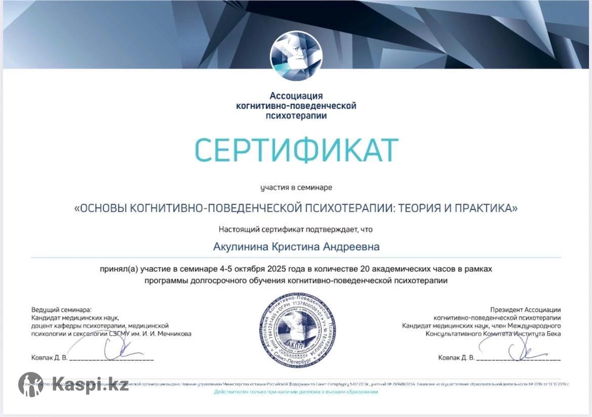 Клинический психолог, член Ассоциация когнитивно-поведенческой терапии. Работаю в когнитивно-поведенческом (КПТ) и интегративном подходах. Депрессивные расстройства Тревожные расстройства (при наблюдении у психиатра) Расстройство пищевого поведения Психотерапия горя и утраты Переезд, смена работы, жизненные кризисы Расставание, развод Взаимоотношения с родителями Взаимоотношения с детьми Работаю со взрослыми и подростками от 14 лет. Формат работы: очно / онлайн Запись: