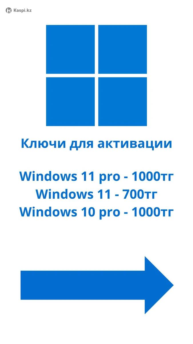 Ключи для активации: Предоплата — 100% на номер Kaspi. Если ключ не будет работать, мы оформим возврат. По всем вопросам и для оформления покупки — пишите! Windows: Windows 11 pro - 1000тг Windows 11 -700тг Windows 10 pro - 1000тг Kaspersky: Kaspersky Free Antivirus 366 Дней 1000тг Kaspersky Internet Security 30,91 Дней -500,1000тг Kaspersky Anti-Virus 91 Дней- 1000тг Kaspersky Total Security 92,93,61,32 Дней -1000,700,500тг Microsoft Office: Office 2019 Pro plus - 1000тг Microsoft Office 2021 Pro Plus- 1000тг