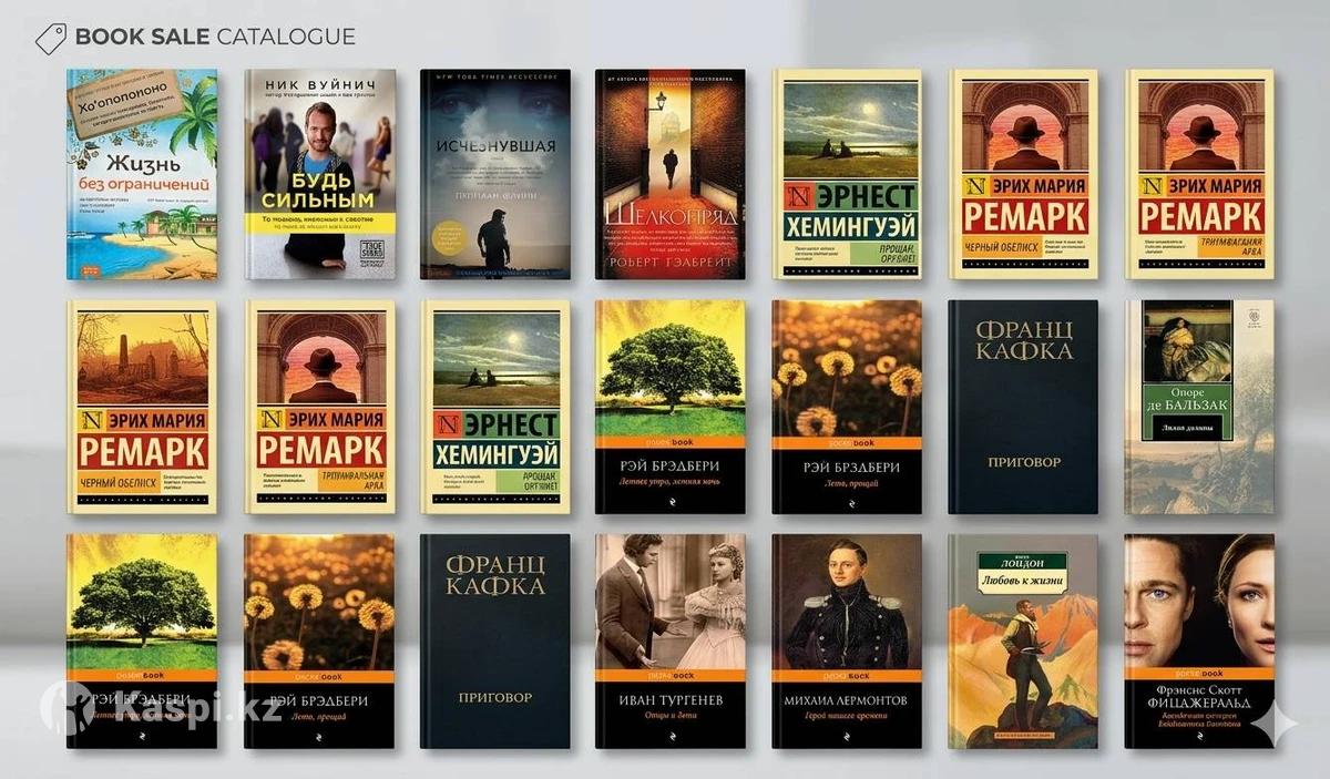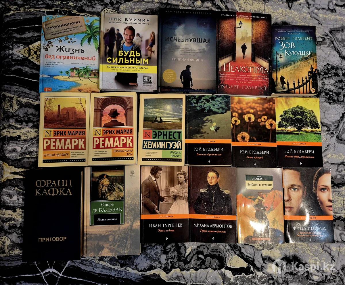 Книги разного жанра, некоторые новые (цены разные от 1000 тг) 1. Исчезнувшая — Гиллиан Флинн (твердый переплет) 2. Шелкопряд — Роберт Гэлбрейт (твердый переплет) 3. Приговор. Сборник — Франц Кафка (твердый переплет) 4. Лилия долины — Оноре де Бальзак (твердый переплет) 5. Будь сильным — Ник Вуйчич (твердый переплет) 6. Зов Кукушки — Роберт Гэлбрейт 7. Черный обелиск — Эрих Мария Ремарк 8. Триумфальная арка — Эрих Мария Ремарк 9. Прощай, оружие! — Эрнест Хемингуэй 10. Жизнь без ограничений — Джо Витале 11. Вино из одуванчиков — Рэй Брэдбери 12. Лето, прощай — Рэй Брэдбери 13. Летнее утро, летняя ночь — Рэй Брэдбери 14. Отцы и дети — Иван Тургенев 15. Герой нашего времени — Михаил Лермонтов 16. Любовь к жизни — Джек Лондон 17. Загадочная история Бенджамина Баттона — Ф. С. Фицджеральд