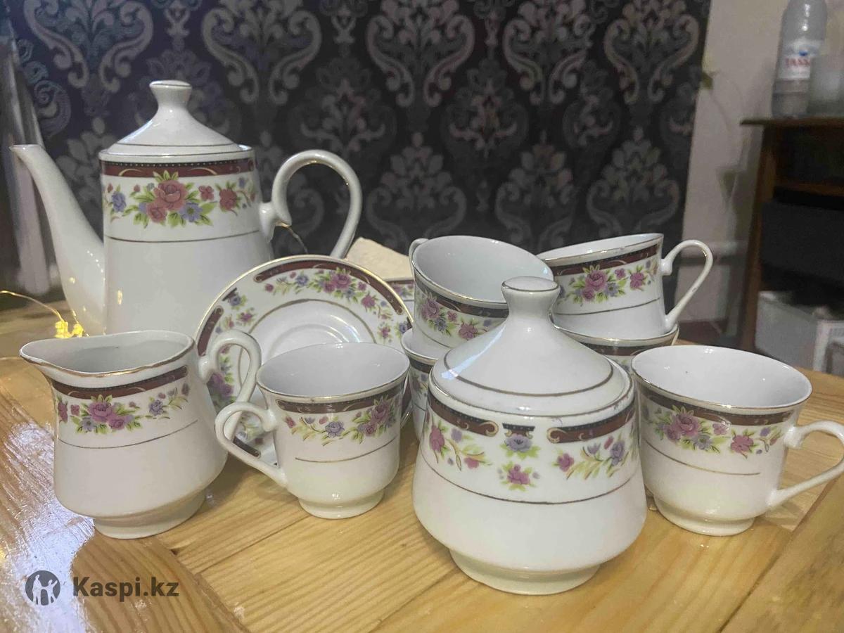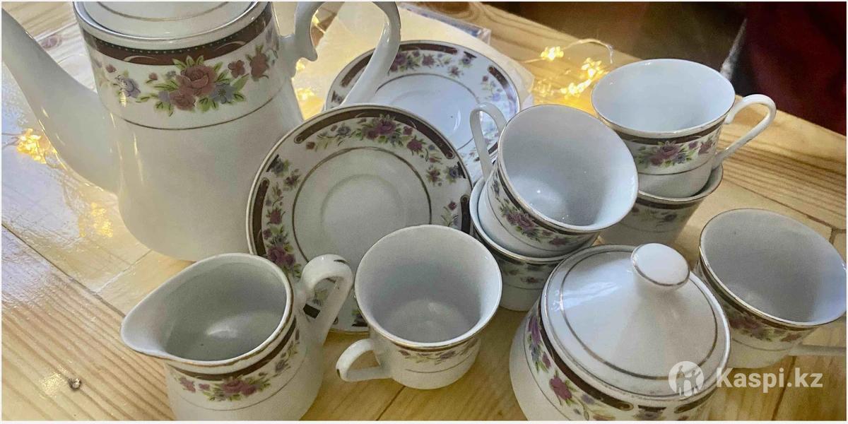 Набор из 6 маленьких чашечек +блюдца, молочник, сахарница, чайник из фарфора