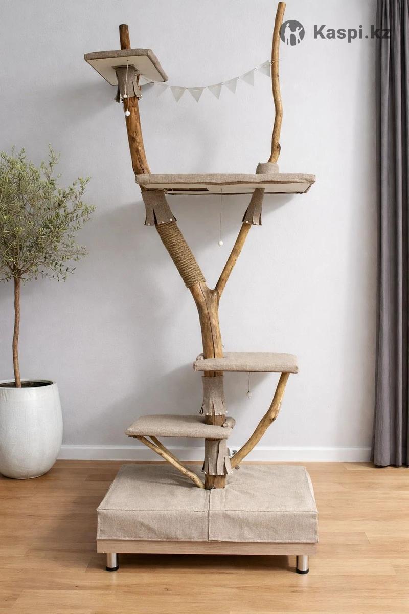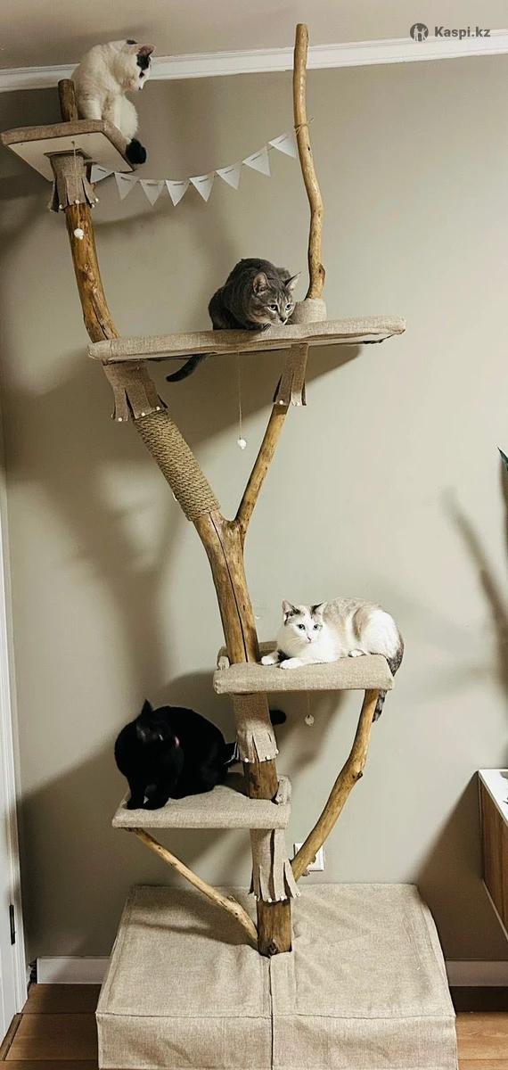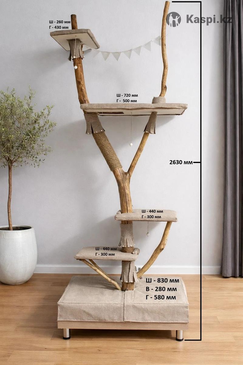 Когтеточка дерево для кошек из натурального дерева Композиция состоит из одного цельного ствола с добавлением веток для укрепления полок. Основание сделано из ЛДСП. Высота комплекса - 263 см. Когтеточка оснащена четырьмя лежаками, большая полка имеет квадратный вырез размером 19 на 15 см для поднятия по конструкций. Весь ствол включая его ветки покрыты тонким слоем акрилового лака. Этот лак безопасен для животных. Вся конструкция стоит надежно, но при желании его можно прикрепить к стене. Комплекс имеет минималистичный и стильный дизайн, который впишется в любой интерьер. Когтеточка будет не только местом для игр кошки, но и интересным элементом в интерьере. Каждое дерево уникально и не повторяется , на изготовление уходит 2 недели. -