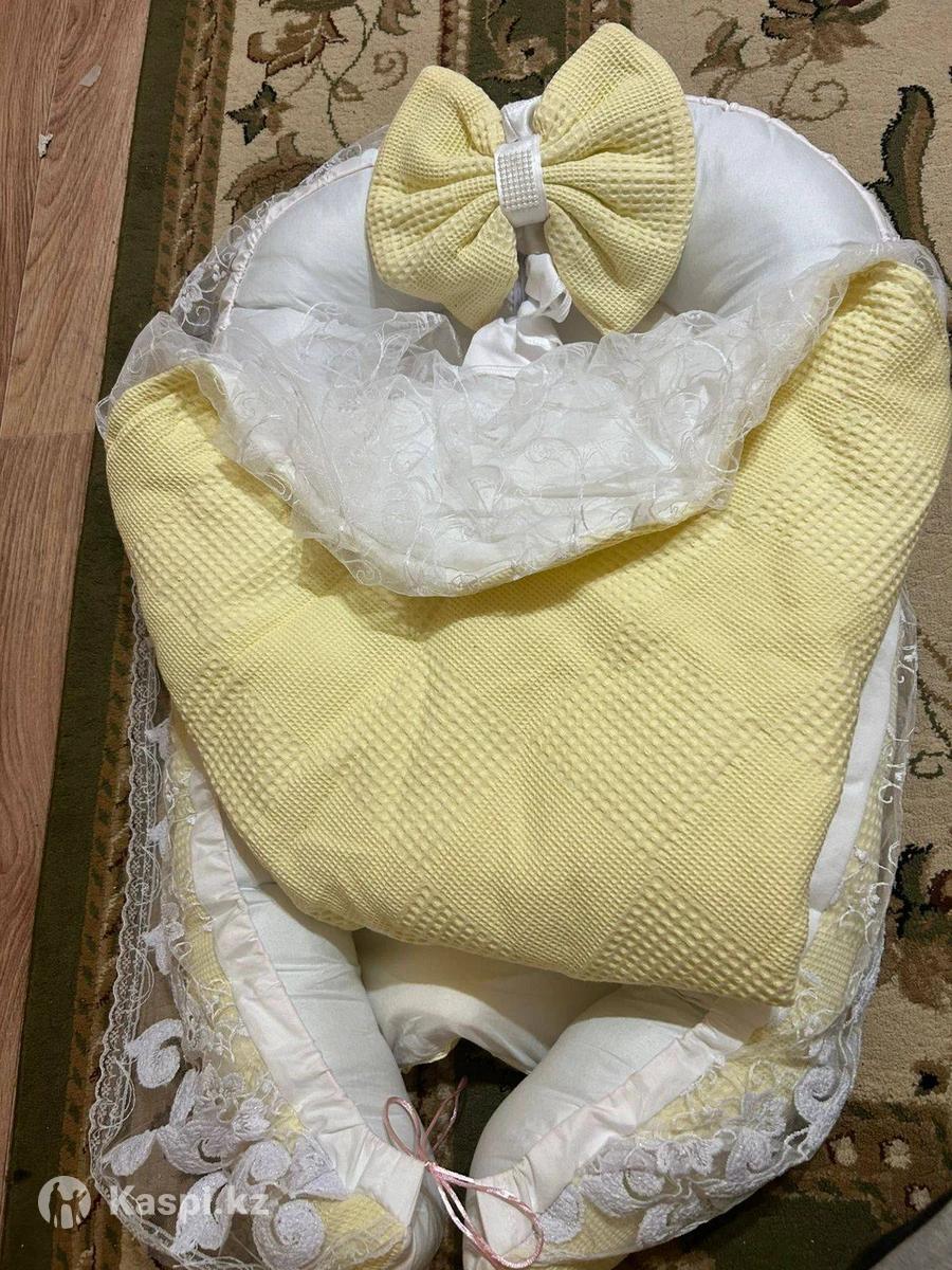 Срочно продается комплект «Кокон и конверт». Состояние новое. Цвет нейтральный желтый. С кружевным шлейфом. Нам подарили. Отдам за 15000тг. Торг есть.