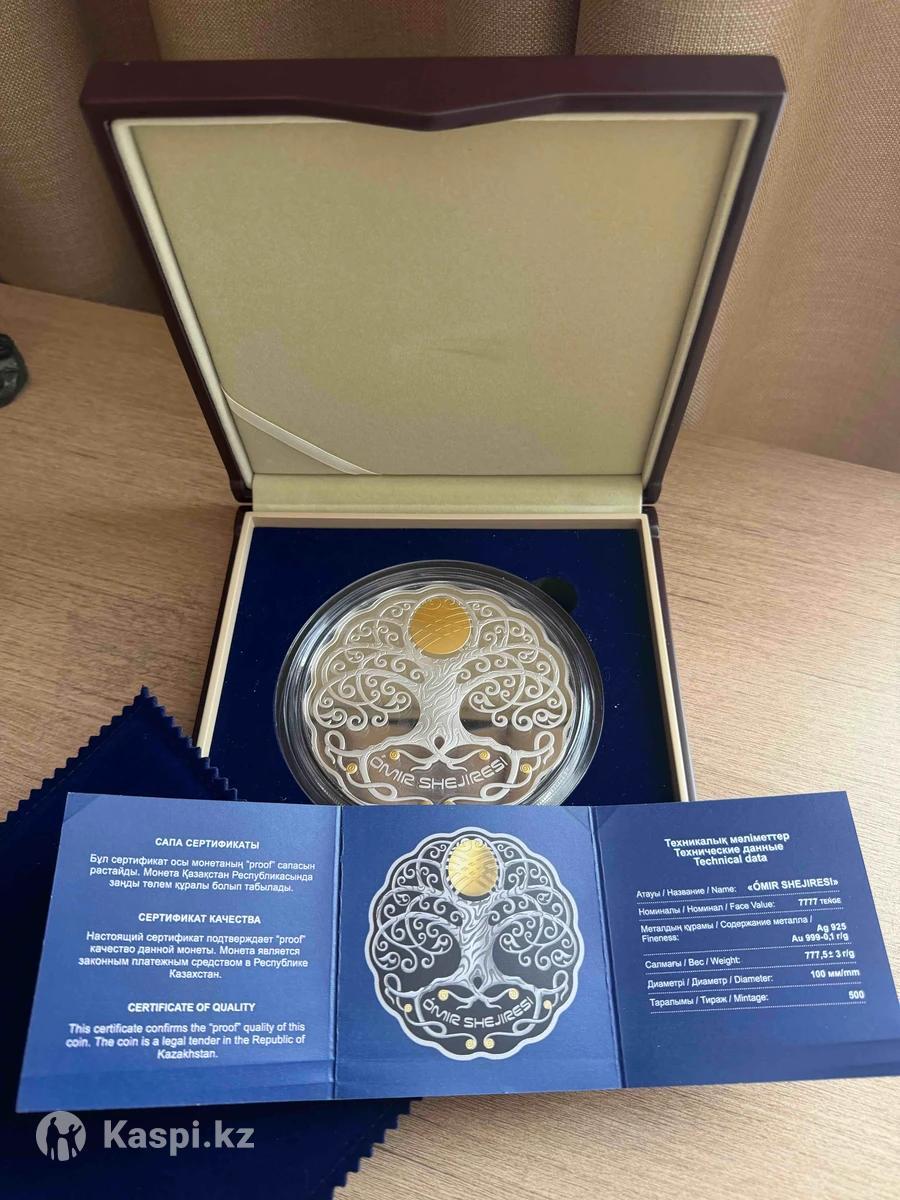 Монета Казахстана «Древо жизни». Вес 777 гр и номинал 7777 тенге. Символизирует удачу, счастье и процветание. Золотое покрытие придает монете блеск и роскошь. На лицевой стороне монеты изображено элегантное дерево, которое является универсальным символом роста, стабильности и жизненной энергии. Каждая ветвь и лист дерева пропитаны детальными рисунками и орнаментами, отражающими богатство. Это делает монету особенно привлекательной для коллекционеров всего мира.