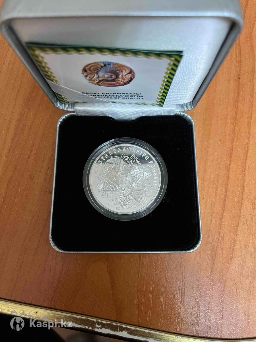 Название монеты: растительный мир казахстана — тюльпан регеля Год выпуска: 2006 Страна: Казахстан Номинал: 500 тенге Металл: серебро 925 пробы Масса: 31,1 гр Диаметр: 38,61 мм На лицевой стороне (аверсе) монеты изображена композиция на основе листьев растений. В левом секторе надпись «500 ТЕНГЕ» расположенная в две строки и обозначающая номинал монеты, надпись «Ag 925 31,1gr.» обозначающая металл, из которого изготовлена монета, его пробу и массу. В верхней части изображение логотипа Национального Банка Республики Казахстан. По окружности расположена надпись «НАЦИОНАЛЬНЫЙ БАНК КАЗАХСТАНА» на государственном языке и «NATIONALBANKOFKAZAKHSTAN» на английском языке. Надписи разделены точками.